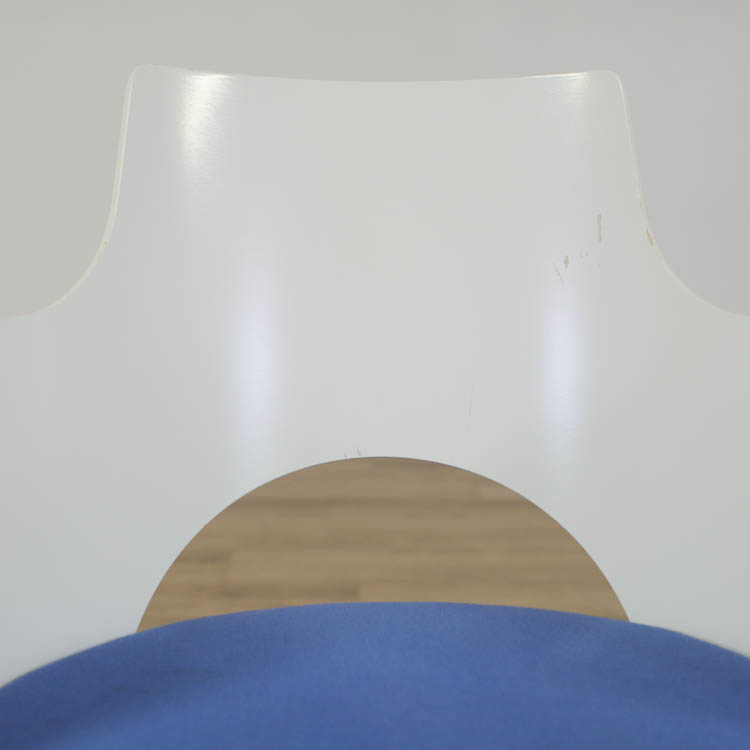Stolen har flertalet synliga skador efter användning. Skador i form av repor samt partier har färgavvikelser samt att delar av det yttre materialet har lossnat. Sitsen är dock i fint skick. Skadorna påverkar inte stolens funktion, utan ger enbart estetiska avvikelser. Se fler bilder på närbilderna i produktannonsen.