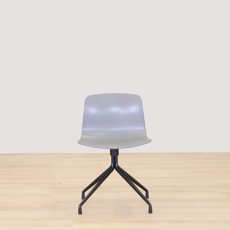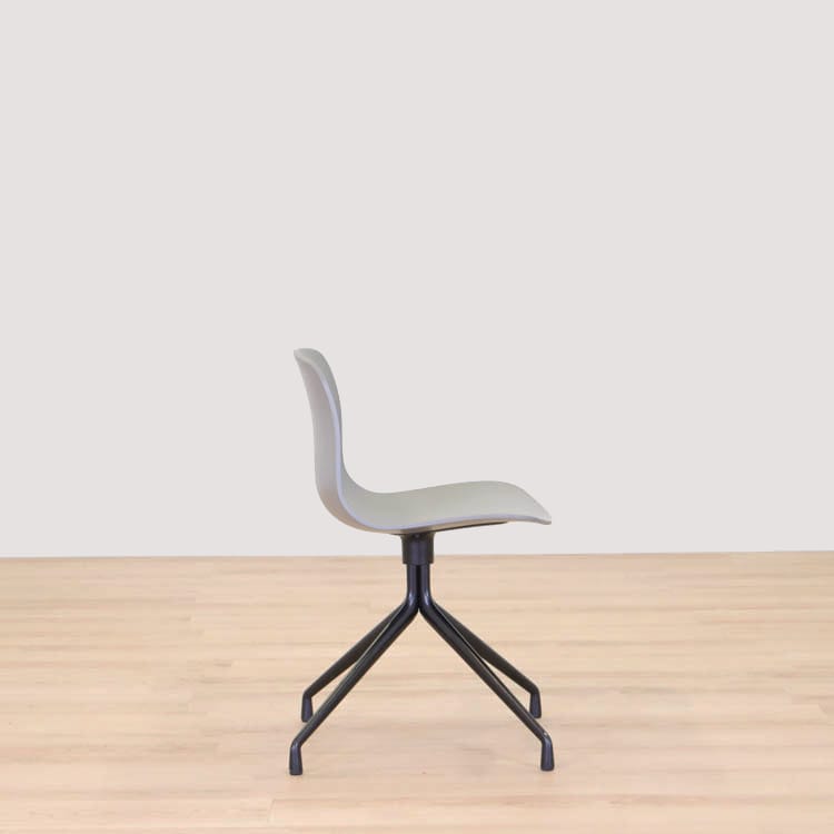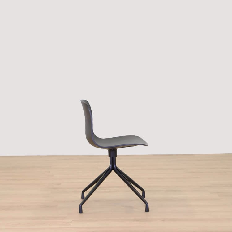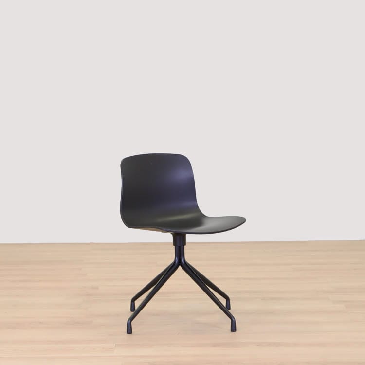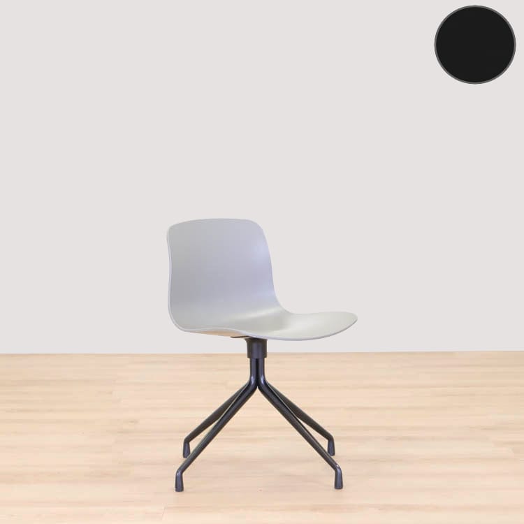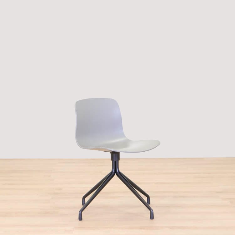 About A Chair AAC10 från Hay är en stilren stol med vridbar bas som ger den ett mer formellt uttryck än de varianter som har träben i samma kollektion. Den behåller den karakteristiska öppna och böjda designen i sätet och benen, som sträcker sig ut från en central bas. Basen är tillverkad av gjuten aluminium och kan rotera. Det återvunna plastskalet kommer i två utföranden, grå med svarta ben och helsvart.