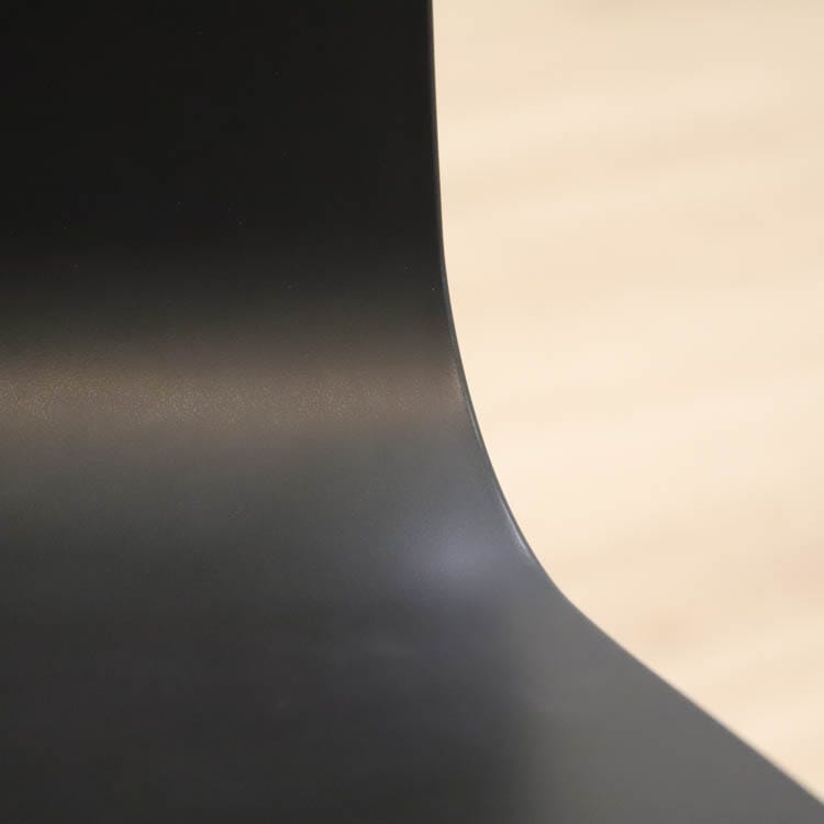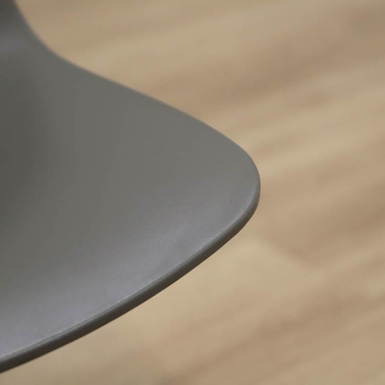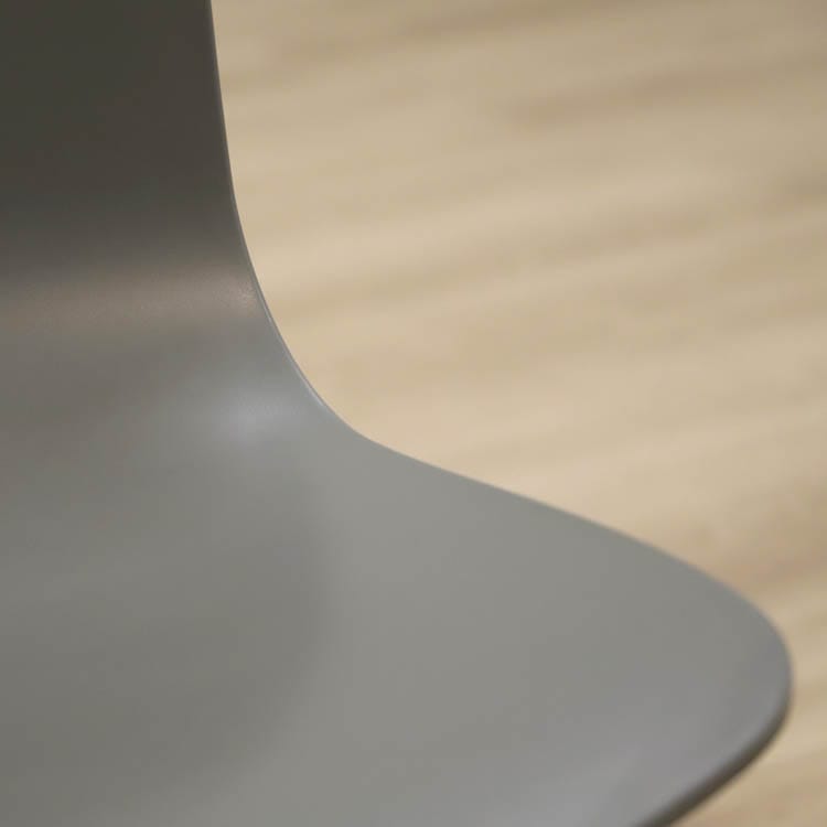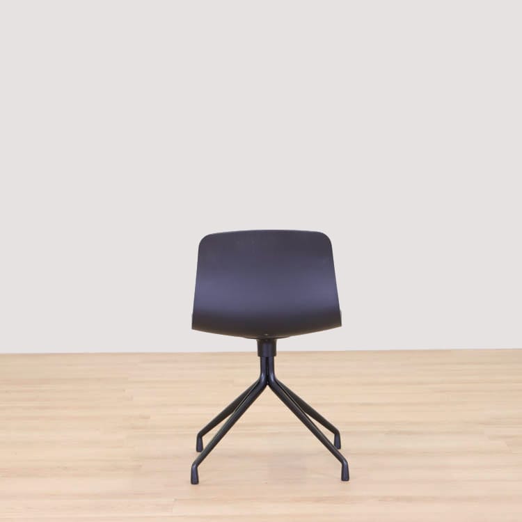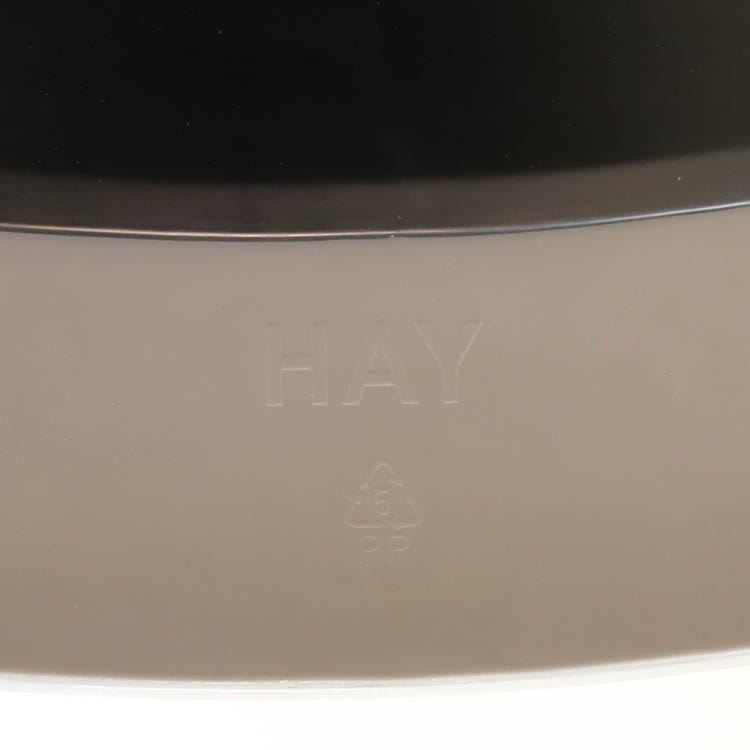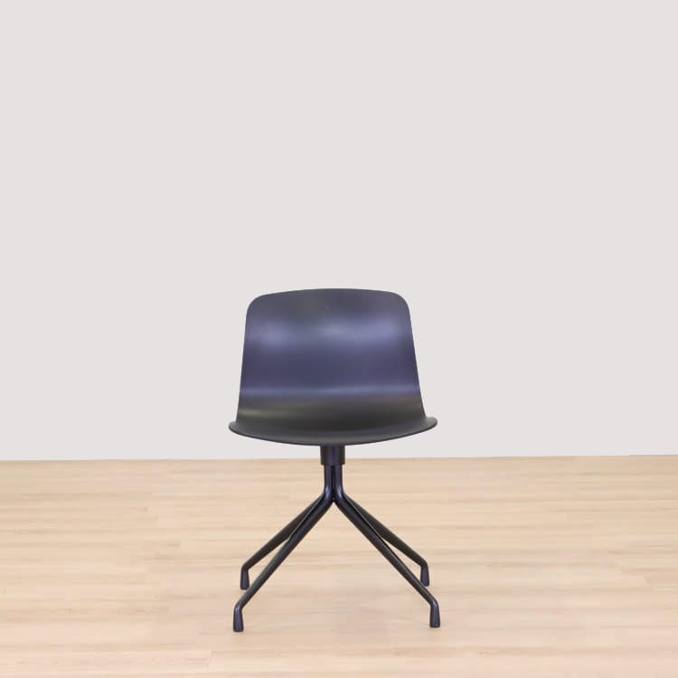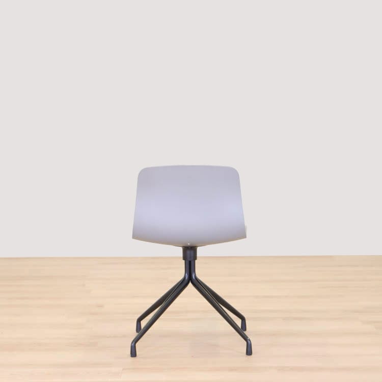 About A Chair AAC10 från Hay är en stilren stol med vridbar bas som ger den ett mer formellt uttryck än de varianter som har träben i samma kollektion. Den behåller den karakteristiska öppna och böjda designen i sätet och benen, som sträcker sig ut från en central bas. Basen är tillverkad av gjuten aluminium och kan rotera. Det återvunna plastskalet kommer i två utföranden, grå med svarta ben och helsvart.