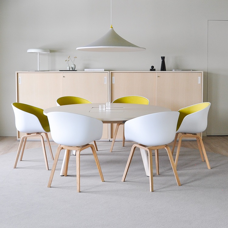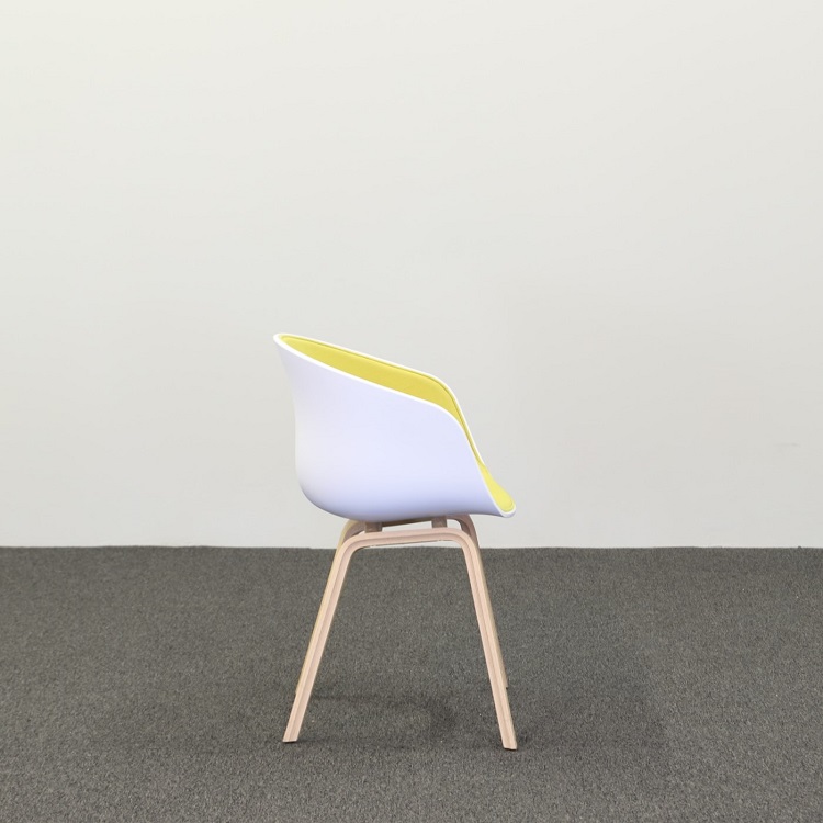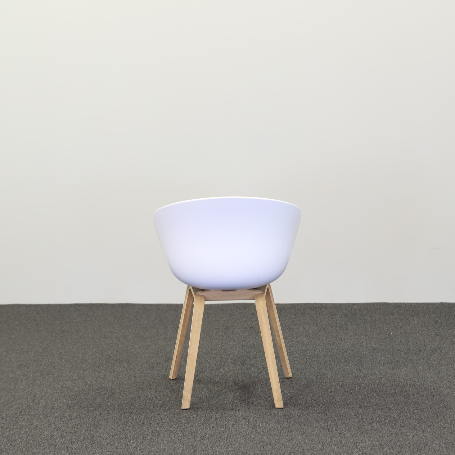 Modellen About a Chair kommer från det danska varumärket HAY och är designad av Hee Welling. Tanken bakom designen var att göra en stol med ovanligt enkel design som passar i princip var som helst. En bekväm och elegant stol med rena linjer klädd i ett uppiggande gult tyg i sitsen, med ben i bokplywood/klarlackad ekfanér och baksida i hårdplast.