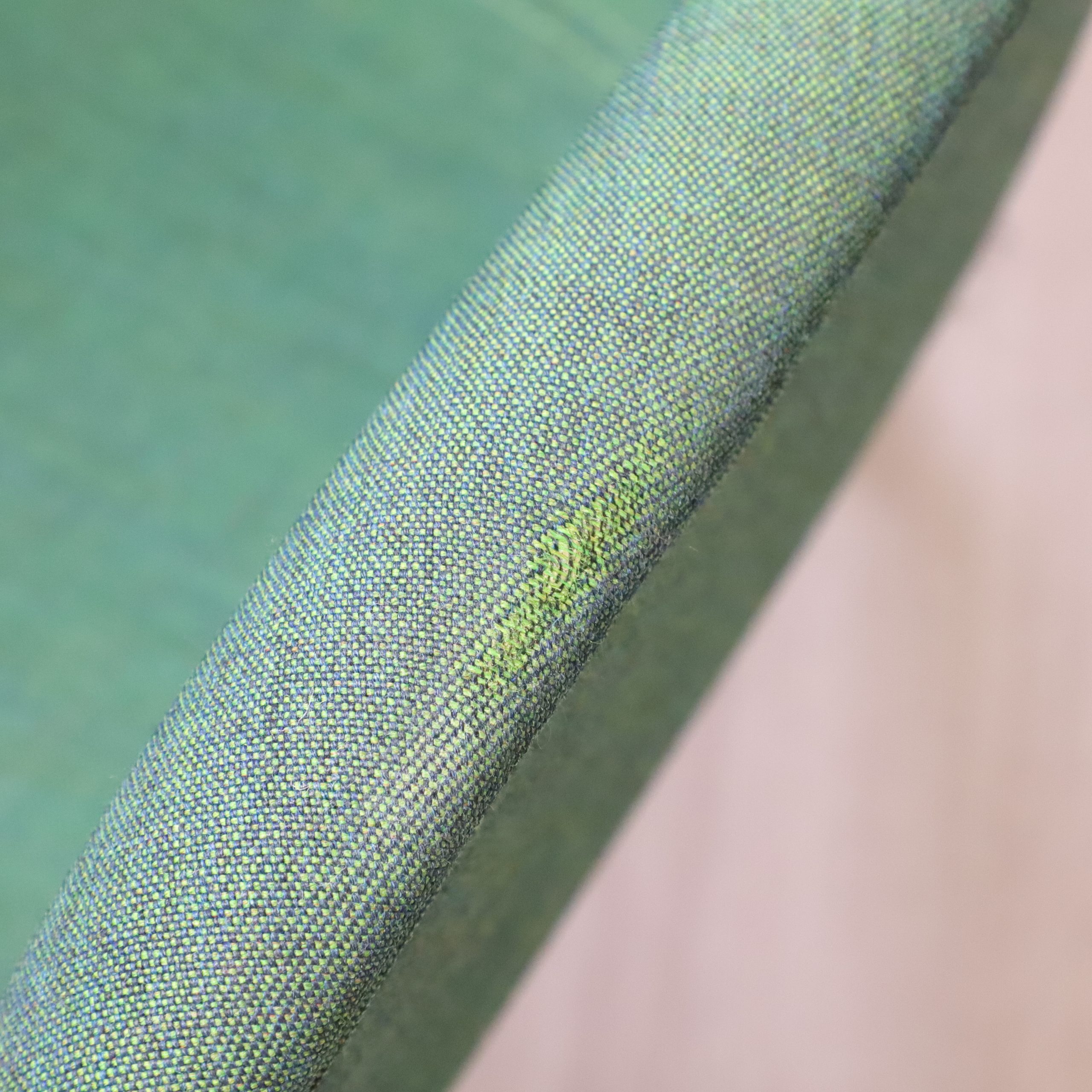 Stolen i grönt utförande har slitningar på armstöden, detta är inget som påverkar funkionalitet eller hållbarhet men har mindre estetiska avvikelser. Se bildvyn för närmare granskning.
