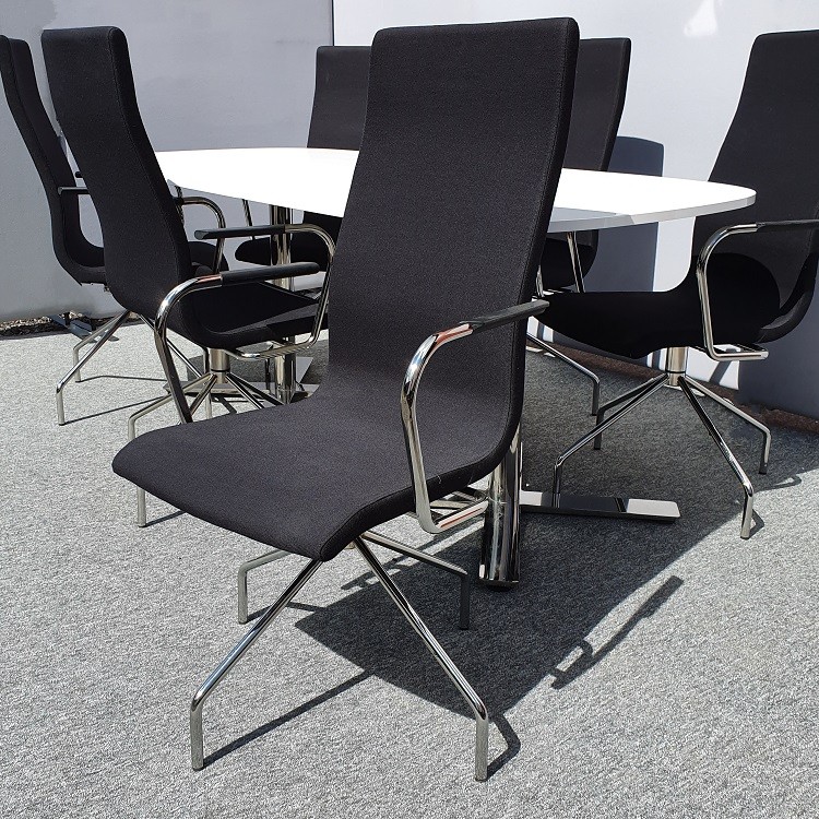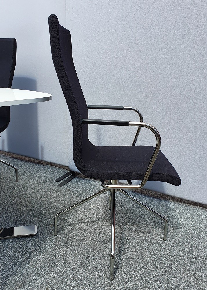 Konferensstol Flex High är en karmstol med hög rygg. Stolen är klädd i svart tyg. Dess kromade och kryssformade underrede är på glidfot och vridbart. Armstöd i svart TPE. Med denna stol får du både stor komfort och smidighet.