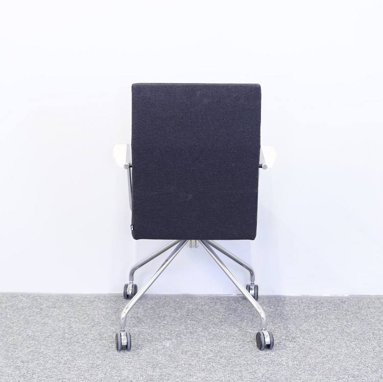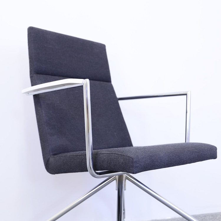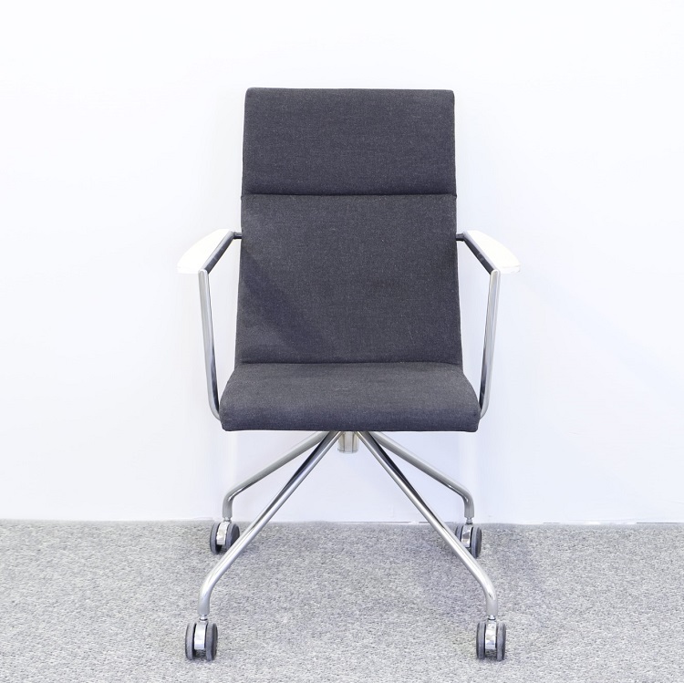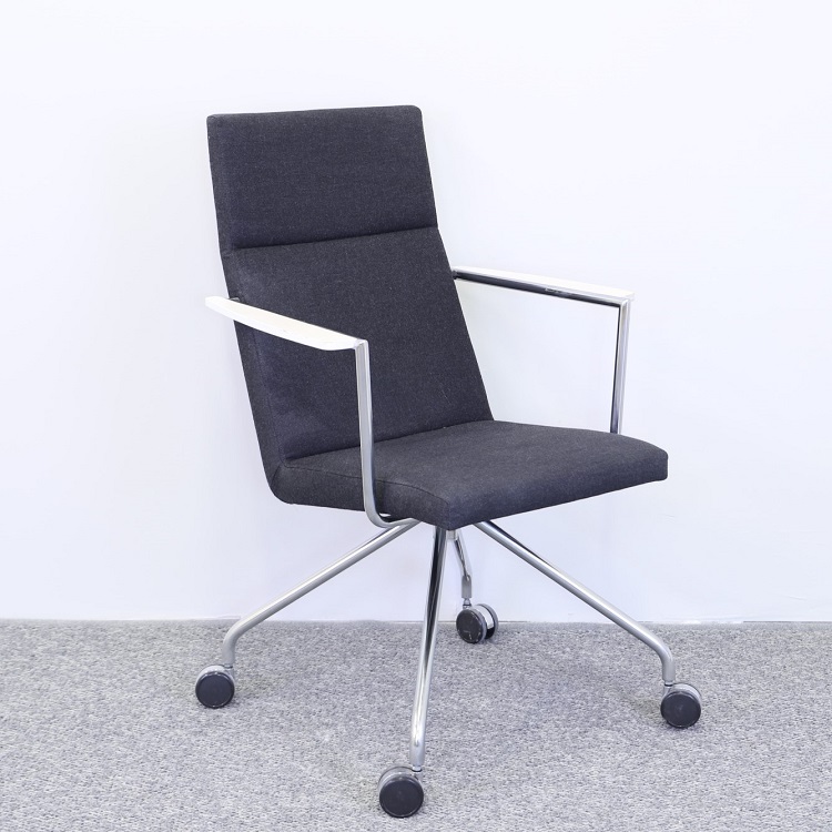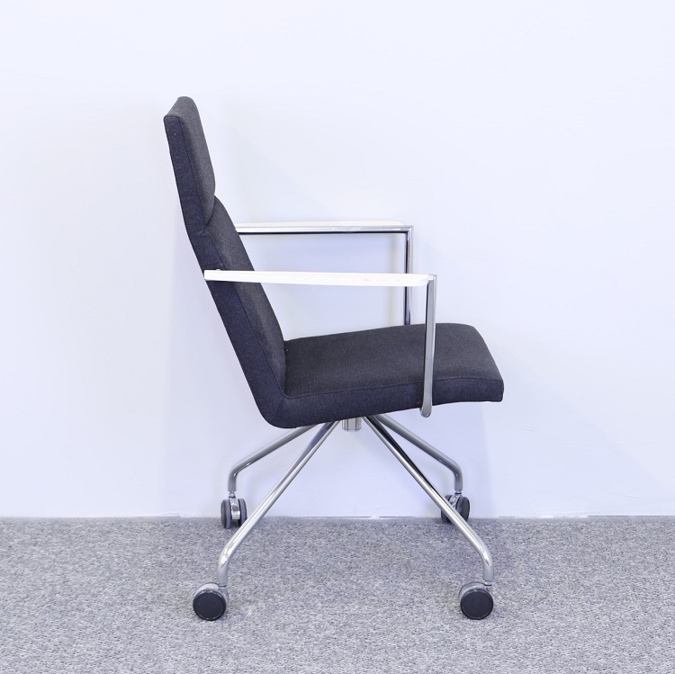 Jukka Setälä är designern bakom denna populära stol. Stilfull design i mörkgrått tyg med funktionella egenskaper som hög rygg, armstöd och ben på hjul. De kromade detaljerna kombineras snyggt med de mörka tyget och armstöden i vitt utförande. Denna stol har hög sittkomfort och flexibilitet, vilket passar sig utmärkt för möten och konferens.