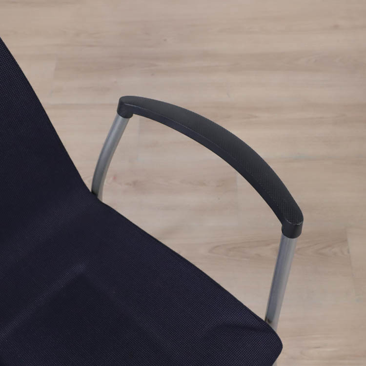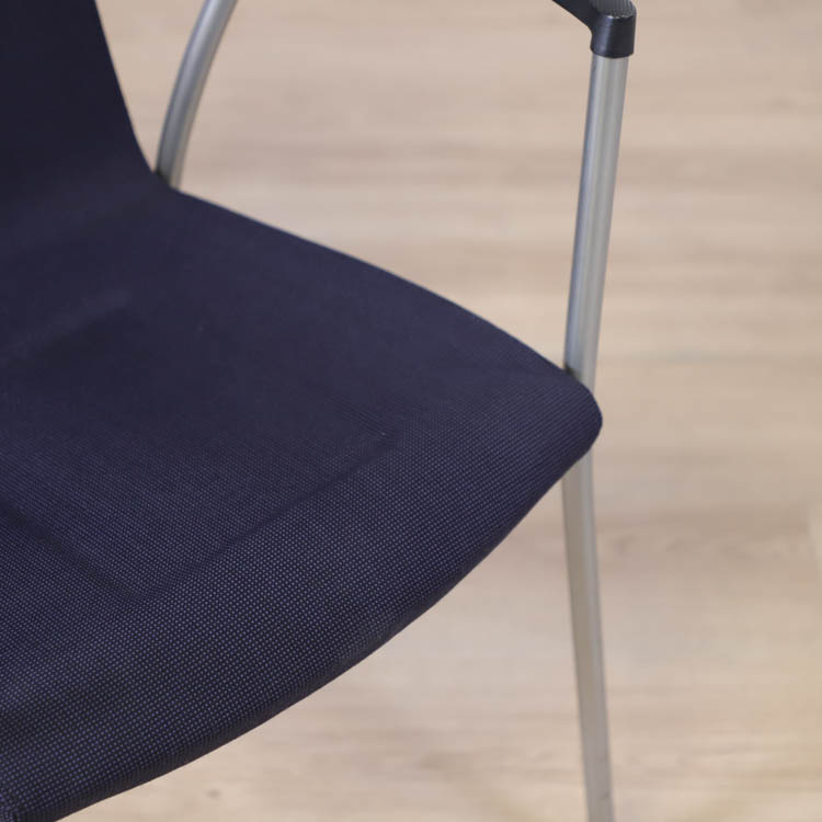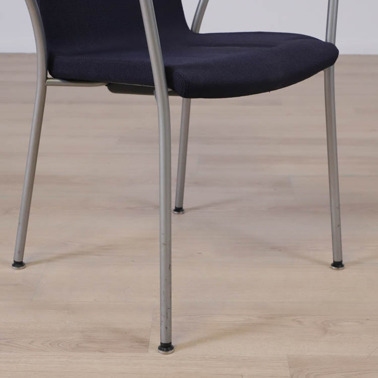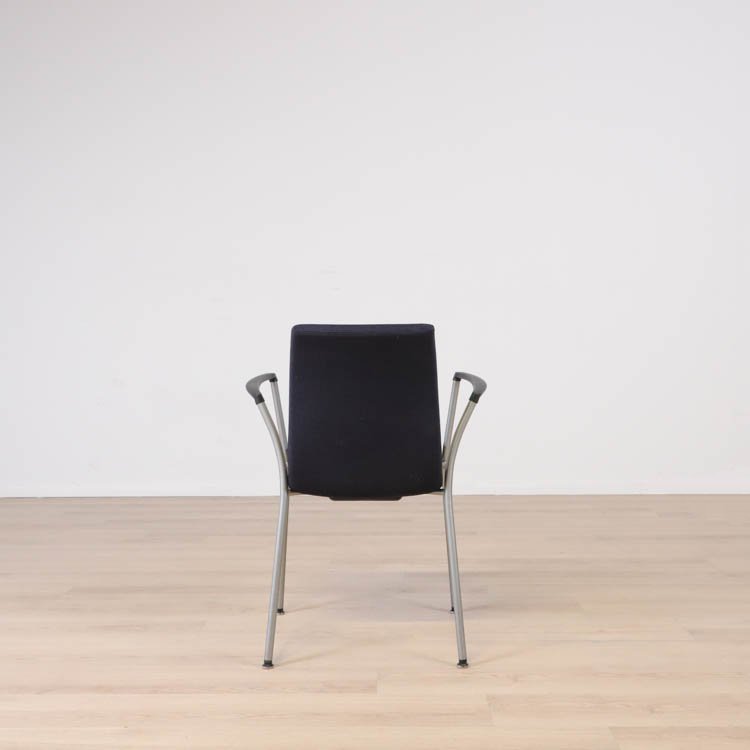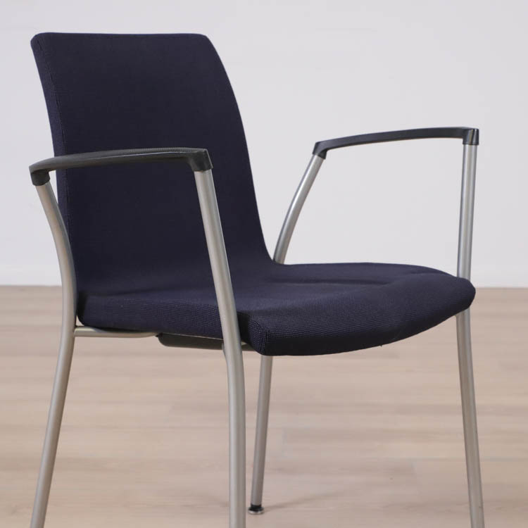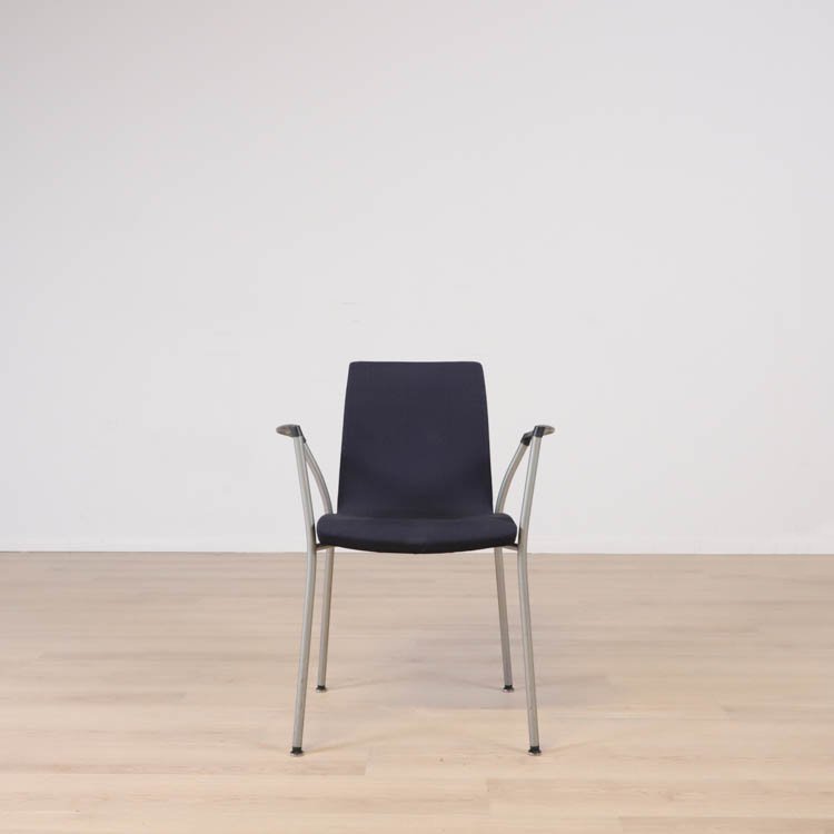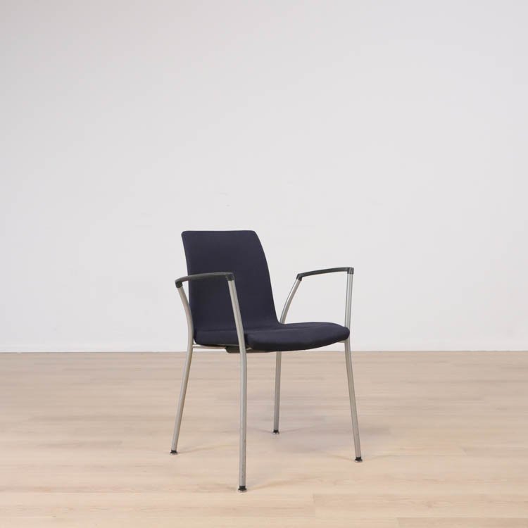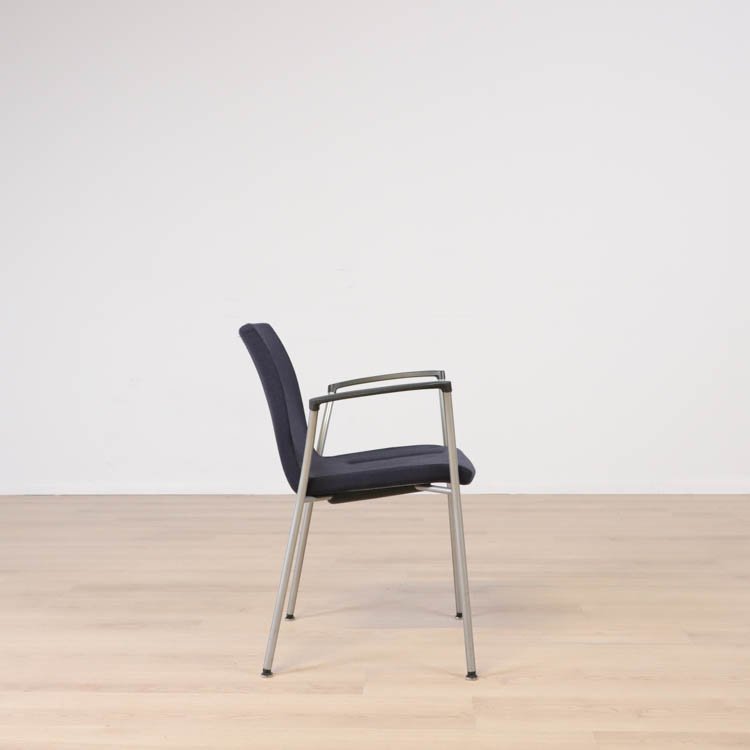 Här i blått tyg på sits, svarta armstöd och grå ben.