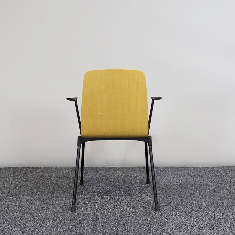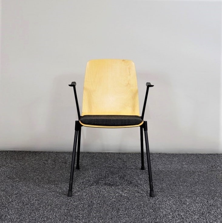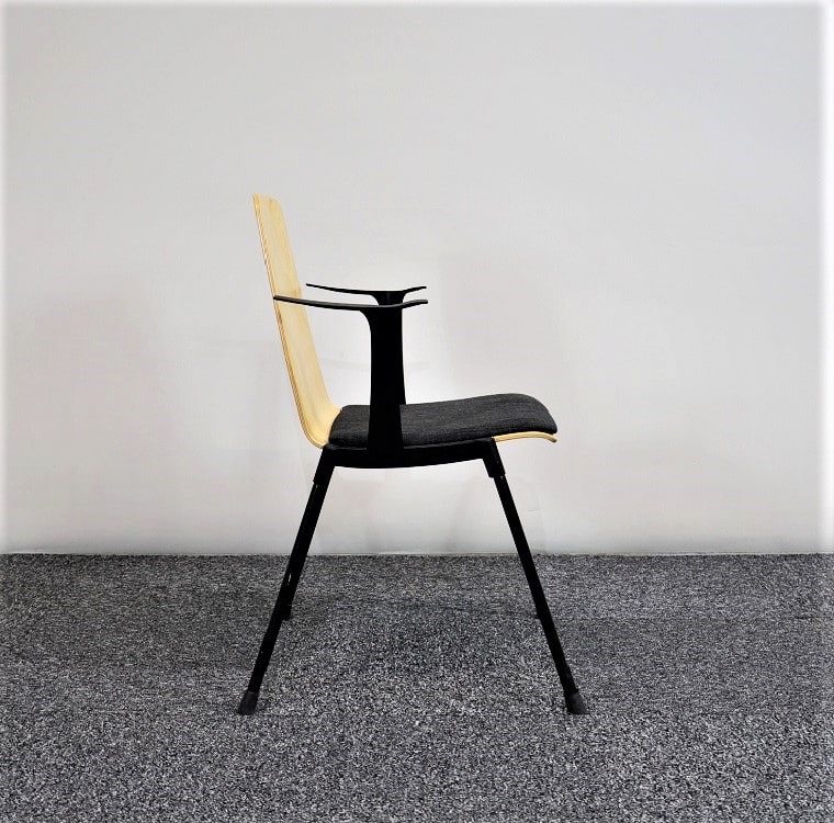 Stapelbar konferensstol från finska P.o Korhonen i formpressad björk med en mjuk dyna klädd i svart textil för ytterligare komfort. Armstödens utformning är det ger en extra twist till utseendet och skapar en stol som inte bara är bekväm utan även en riktig blickfångare.