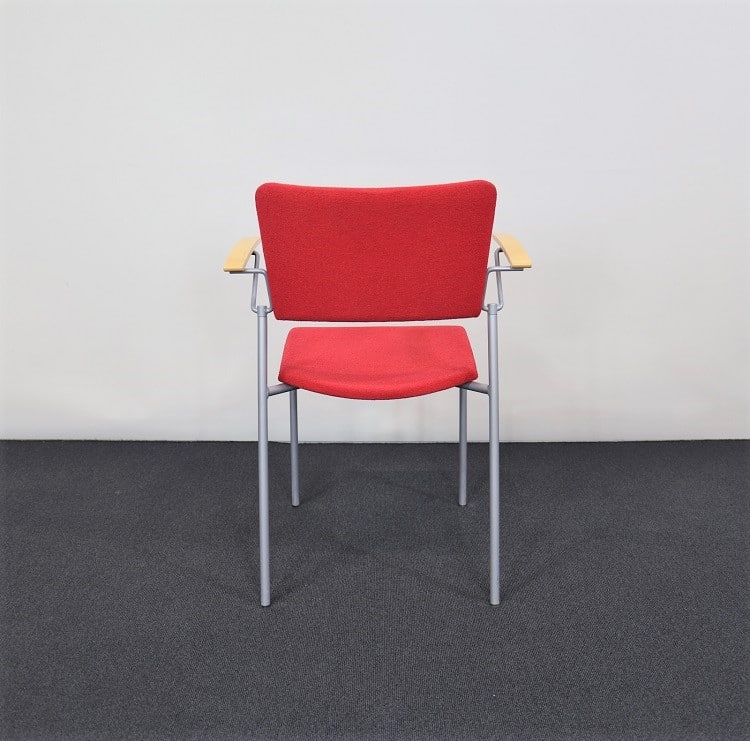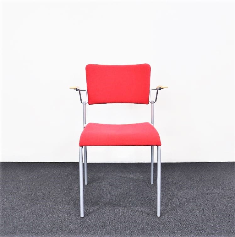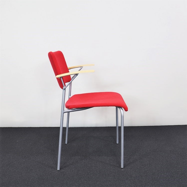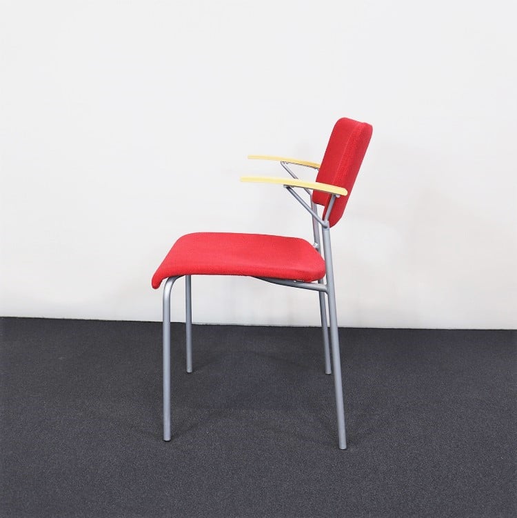 En funktionell stol från Miljöexpo med en bekväm lätt stoppad sits i ett rött tyg som ger en extra härlig färgklick i mötesrummet eller konferenssalen. Finns tillgänglig både med eller utan armstöd. Stolen är stapelbar och upphängningsbar i utförandet med armstöd.