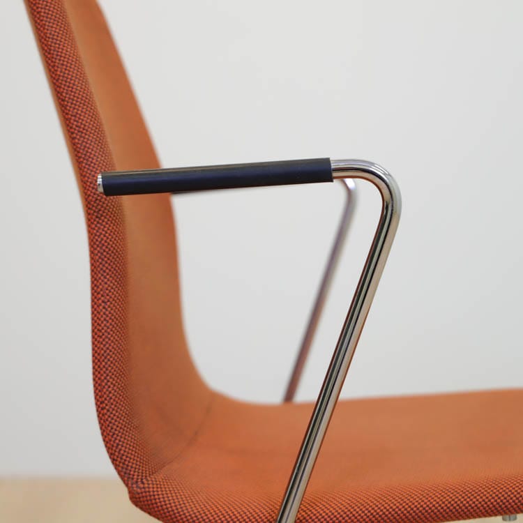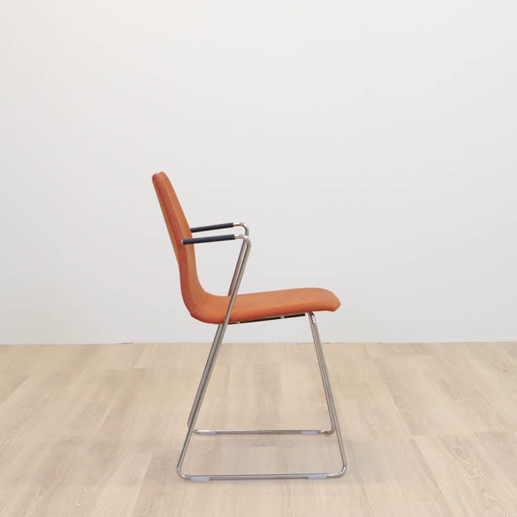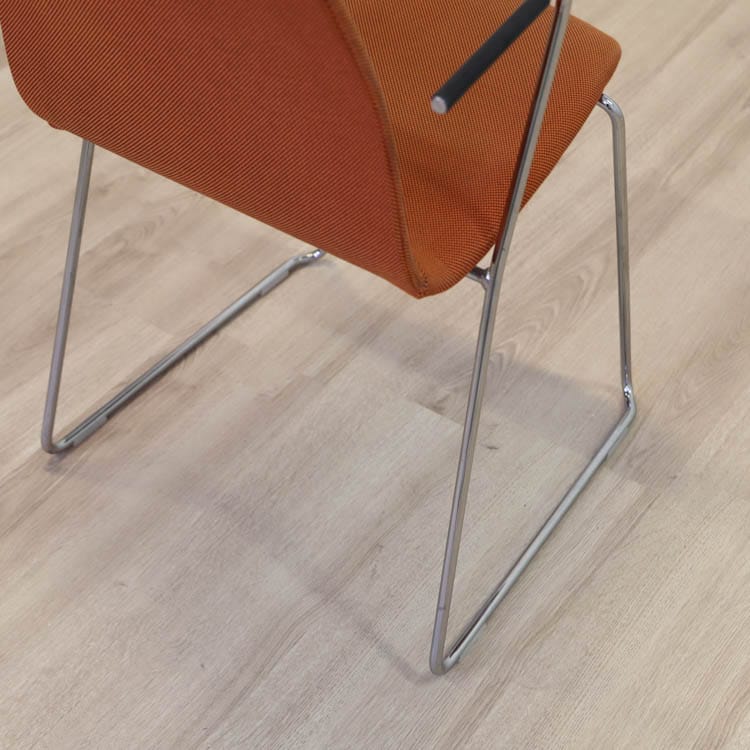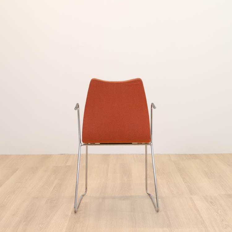 En smart stapelbar konferensstol som är bekväm tack vare rejäl stoppning och sittskal i formpressat trä. Underrede är förkromad metall och klädd i ett brunt tyg.