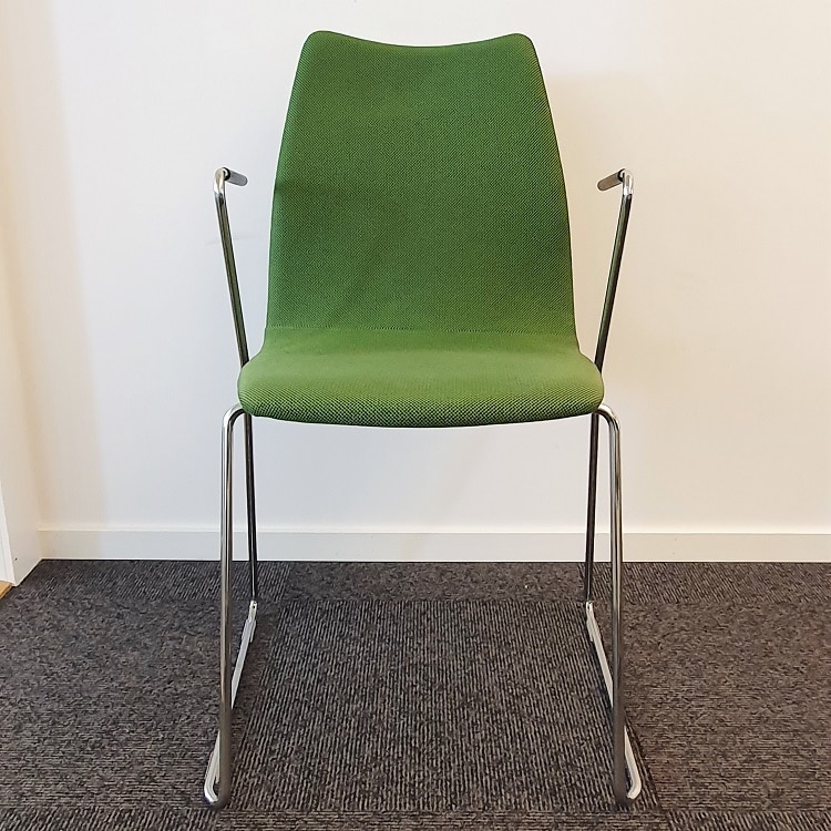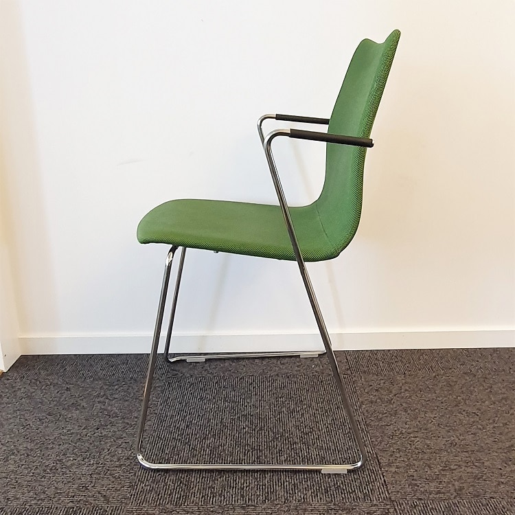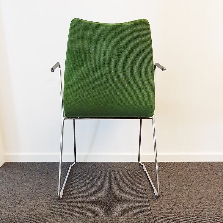 En smart, stapelbar konferensstol som är bekväm tack vare sin rejäla stoppning och sittskal i formpressat trä. Underrede är förkromad metall och klädd i ett grönt tyg som piggar upp. Låt konferensstolen Knuff bli en härlig färgklick i ditt konferensrum, fikarum eller annan plats som behöver lite extra liv.