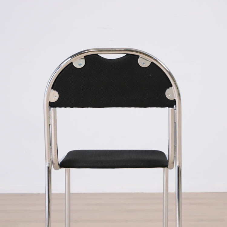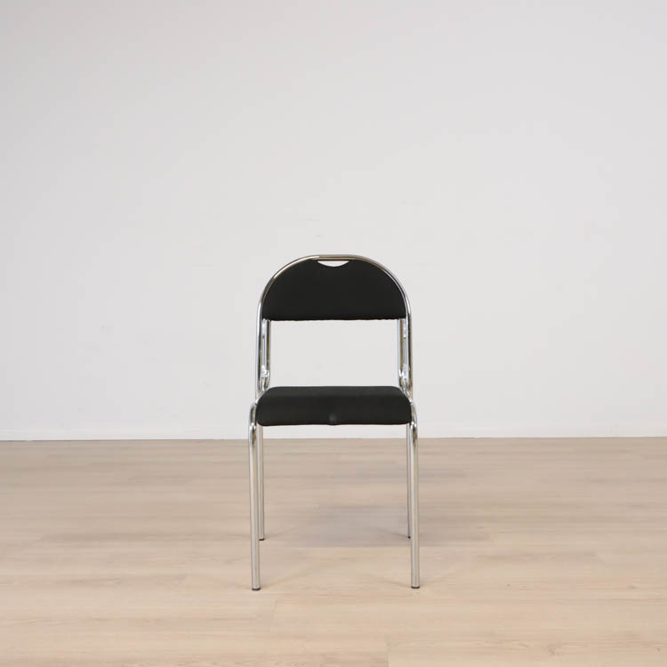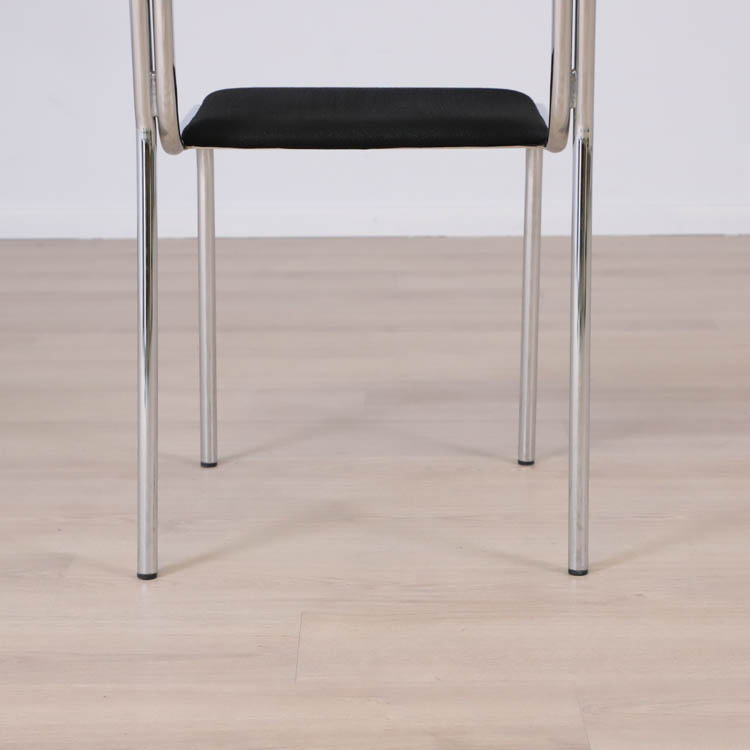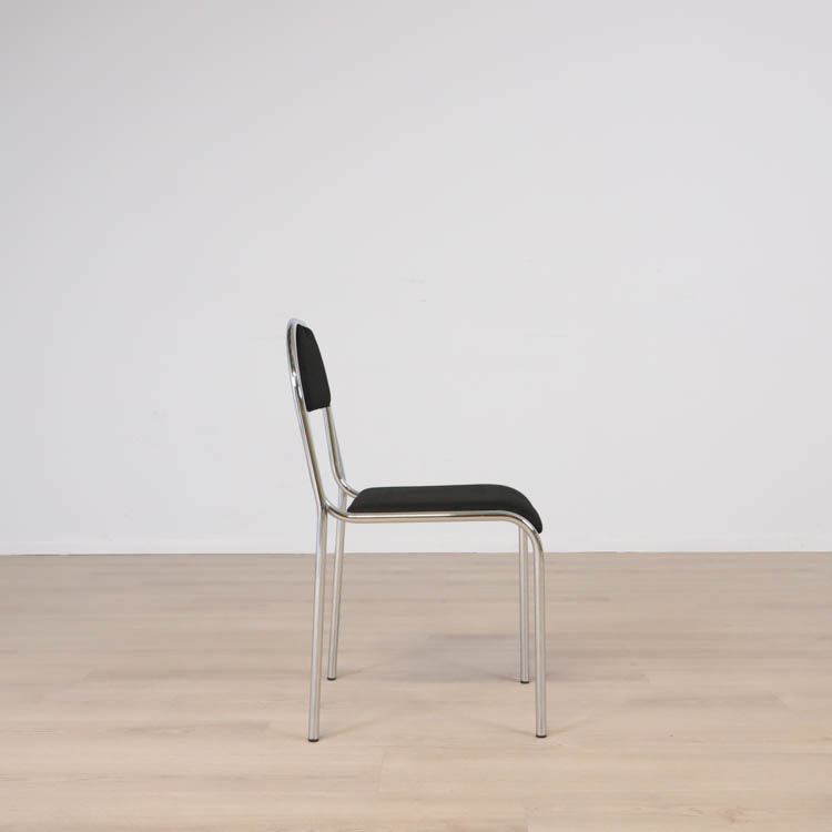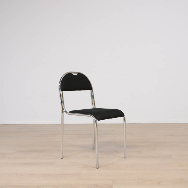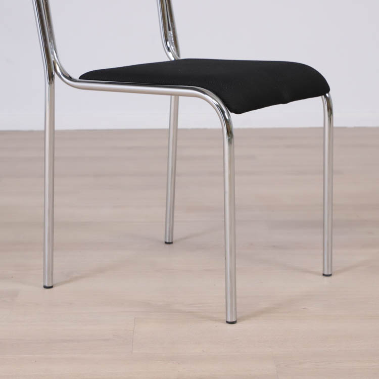 Sits och rygg är klädd i svart tyg och stativet är en pulverlackerad rörställning.
