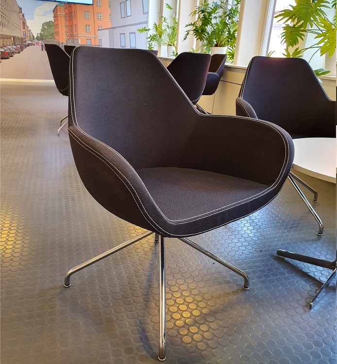 Ziv är en komfortabel och mångsidigt användbar stol med fåtöljkänsla. Den är svartklädd i tyg Evo, har kromat stativ och vit kantsöm.