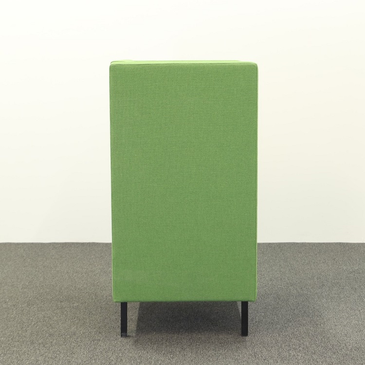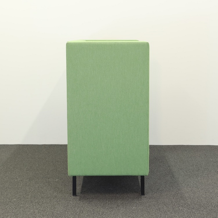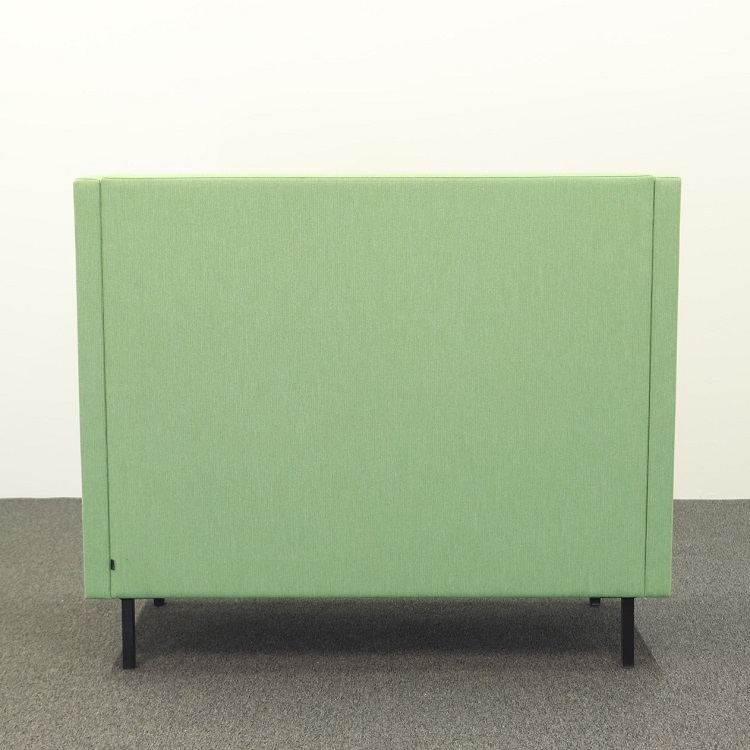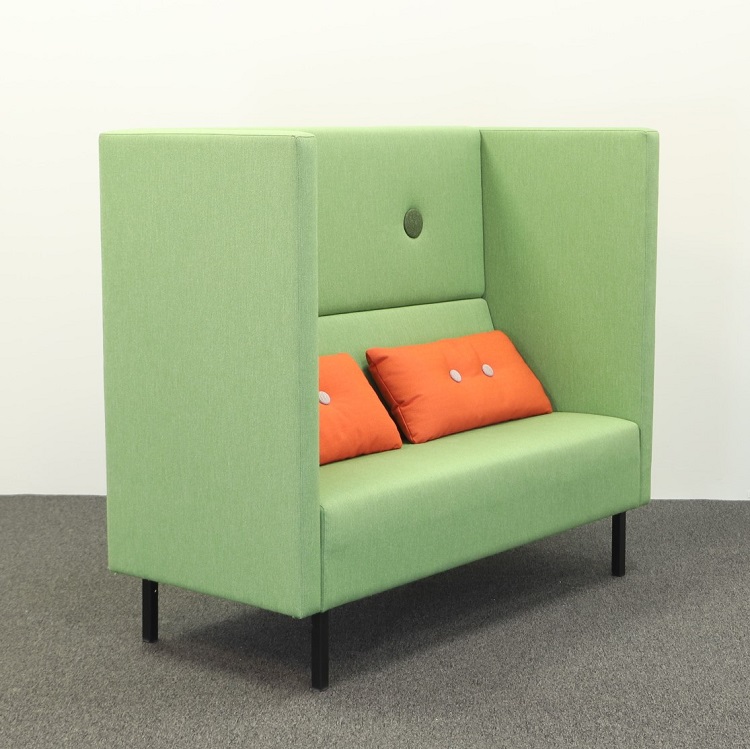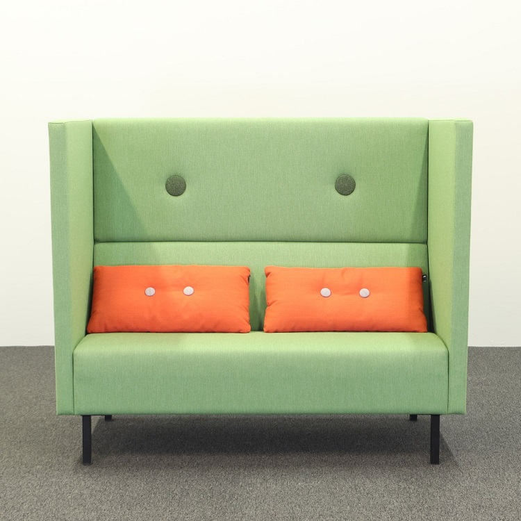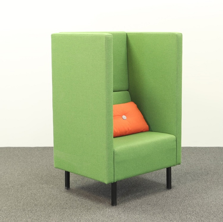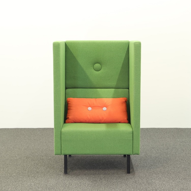 Loungegruppen Mute från Mitab är perfekt på kontoret för att skapa en avskild miljö där man kan prata ostört i telefon eller bara ta en paus utan att distrahera övriga kollegor. Det går att köpa soffa och fåtölj separat eller i en grupp. Båda har en grön härlig klädsel, på fåtöljen en något mörkare grön än soffan, som tillsammans med kuddarna i orange från HAY utstrålar en glad och positiv känsla. Mute är designat av Joel Karlsson där den höga ryggen gör dessa möbler som perfekta rumsavdelare.