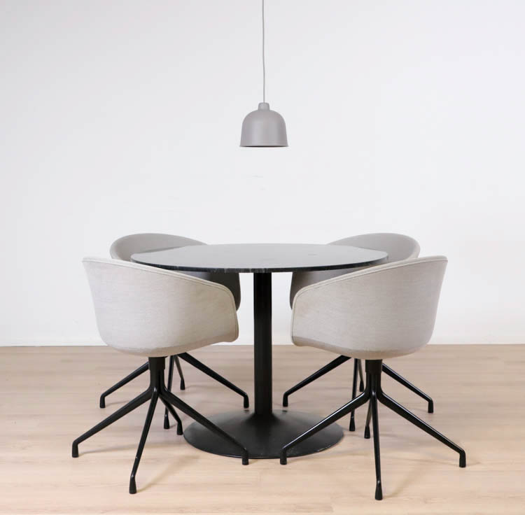 Förundras över matbordet Plaza från Skånska Möbelhuset. En symfoni av elegans och funktionalitet där varje detalj bär på en unik historia. Denna runda skapelse är en konstnärlig pjäs med en förtrollande toppskiva i äkta grå marmorsten.