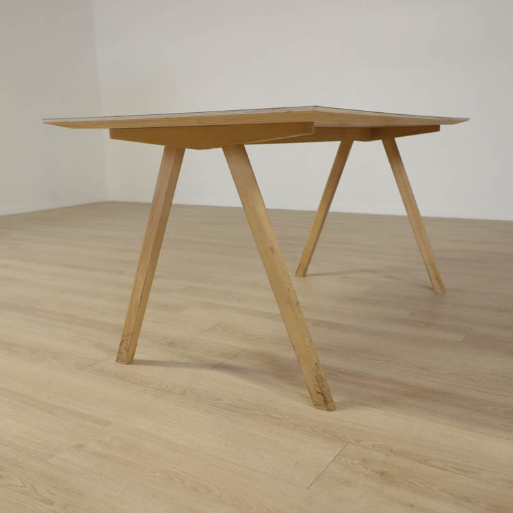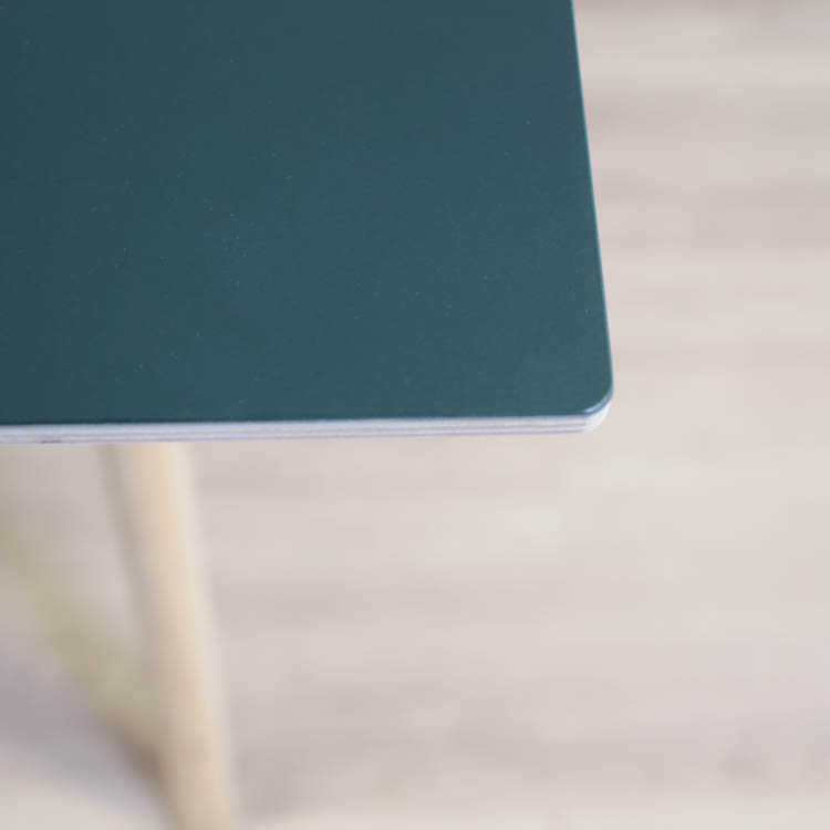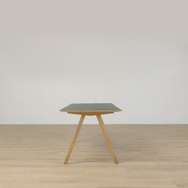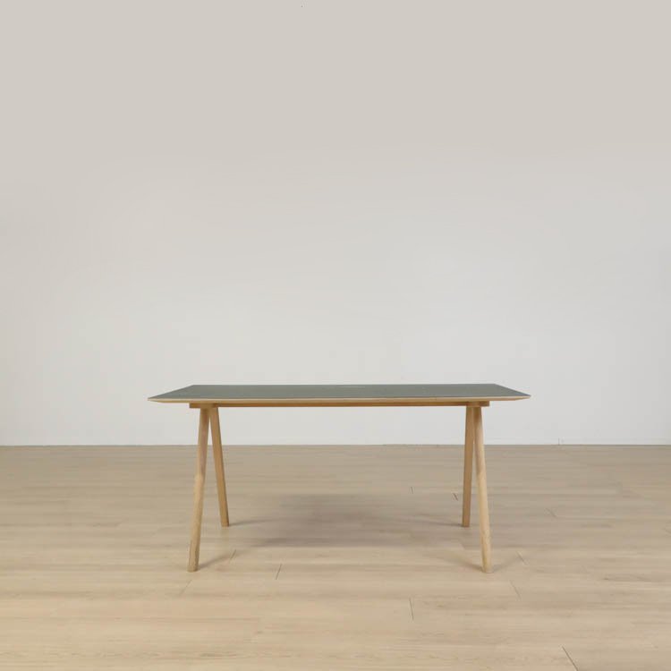 CPH30 2.0 från HAY tillhör den stilrena Copenhague-serien designad av bröderna Bouroullec. Med sin rektangulära bordsskiva och distinkt vinklade ben kombinerar bordet funktion och form på ett elegant sätt. Med sitt stilsäkra uttryck passar den lika bra både i hemmet och på kontoret. Här med grön linoleum skiva och underrede i ek.
