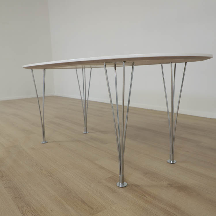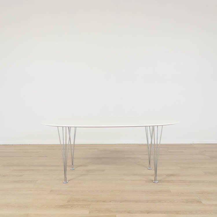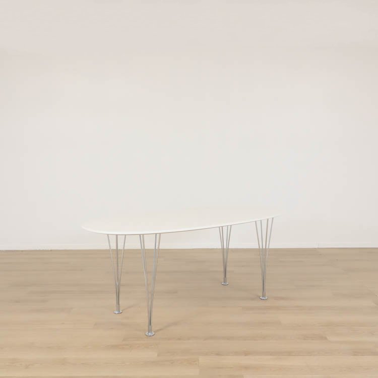 Konferensbordet Superellips är skapat av Bruno Mathsson som tagit inspiration från Piet Heins genialiska lösning på ett trafikproblem vid Sergels torg i Stockholm år 1958. Kravet var att skapa en rondell som både var funktionell och estetisk tilltalande. Piet Hein skapade då formeln för en figur som han kallade Superellipsen. Med denna formel som grund kunde han nu konstruera kurvor i olika storlekar där krökningsradien varierade lagbundet hela vägen. Detta resulterade i ett harmonisk sammanhang och en funktionell trafiklösning. Detta bord är ett av de mest berömda och eftertraktade borden från Skandinavien. De rundade kanterna ger ett mer inkluderande intryck som bjuder in till samtal. Detta utförande i nylackerad vit skiva. Benen kallas spännben och är i förkromat stål och skapar den unika designen på bordet.