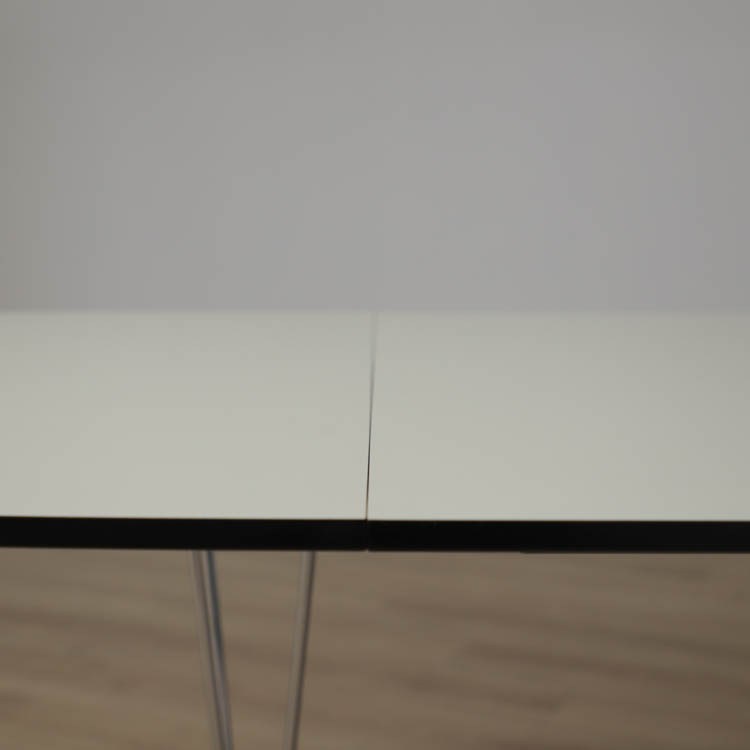 Bordet har en vit skiva med en stilren svart kant, vilket ger en modern och tidlös estetik. Det är utdragbart och kan förlängas med upp till två extra skivor på 50 cm, vilket gör att längden kan anpassas till 180 cm, 230 cm eller 280 cm. De kromfärgade benen, tillsammans med den stabila konstruktionen, ger både hållbarhet och ett luftigt intryck.