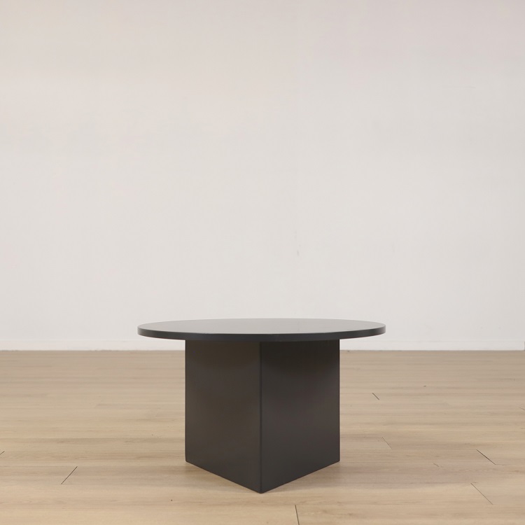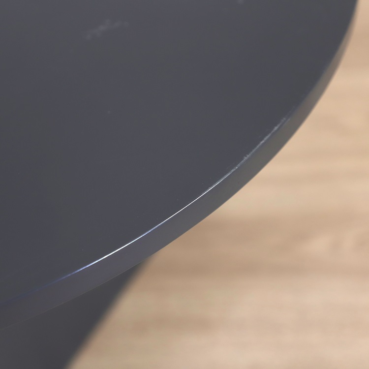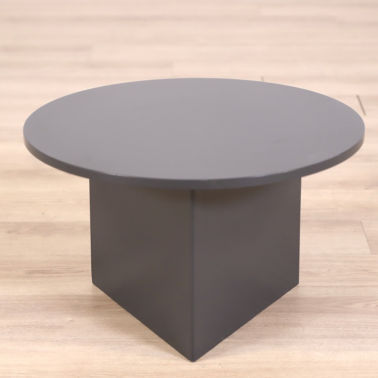Mörkgrått soffbord med rund bordsskiva och ett unikt stativ format likt en prisma, vilket skapar en exklusiv känsla. Med en modern formgivning och intressanta kontrast mellan den mjukt, rundade skivan mot det kantiga och kaxiga stativet så är soffbordet ett unikt exemplar av möbel. Soffbordet är därför lika lämpligt i hemmet som på kontoret.