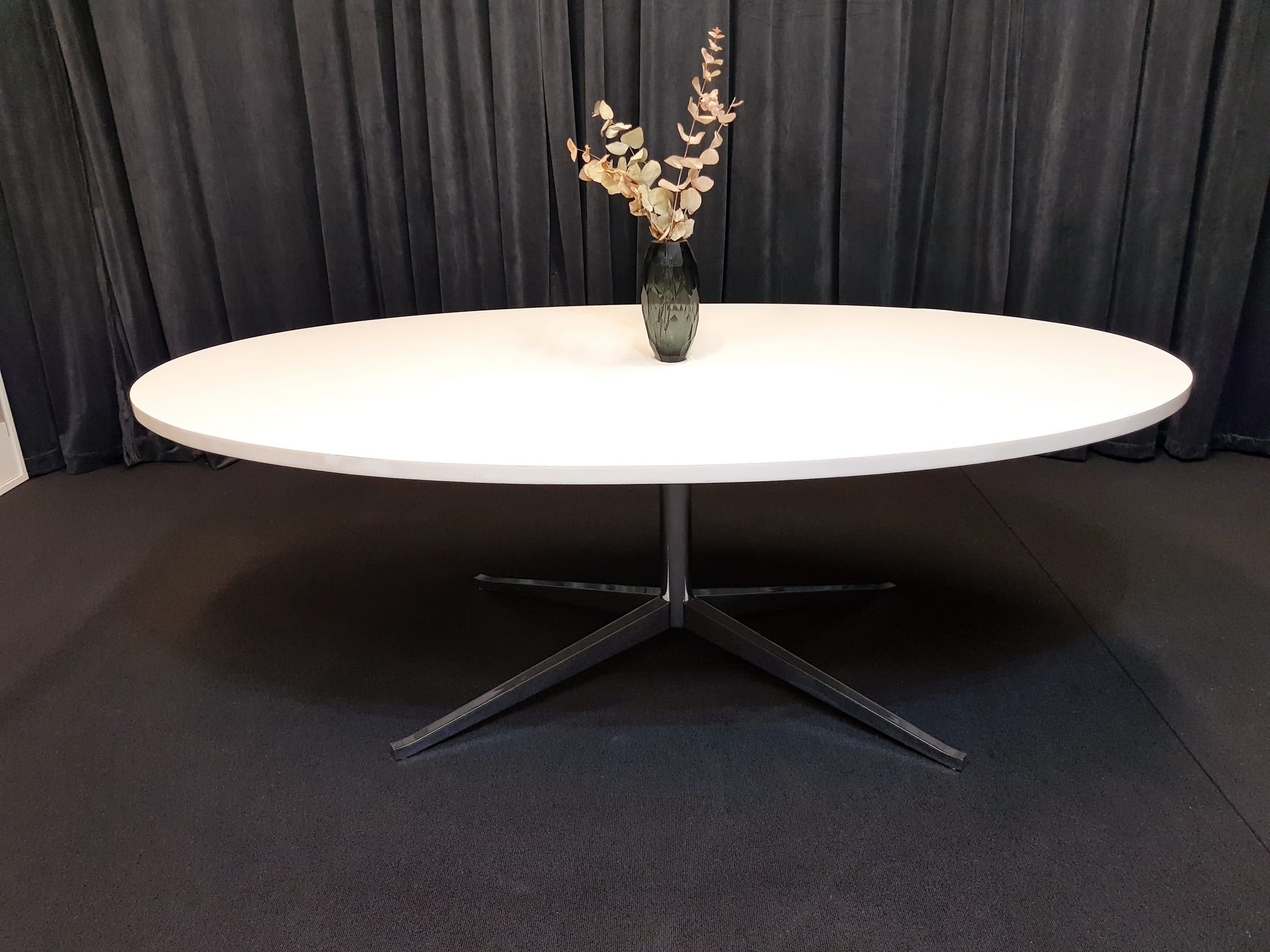 Ett snyggt och rejält bord som passar utmärkt som både mötesbord och matbord. Bordet har en vit, blank bordsskiva i vitt och ett tungt, kromat krysstativ.