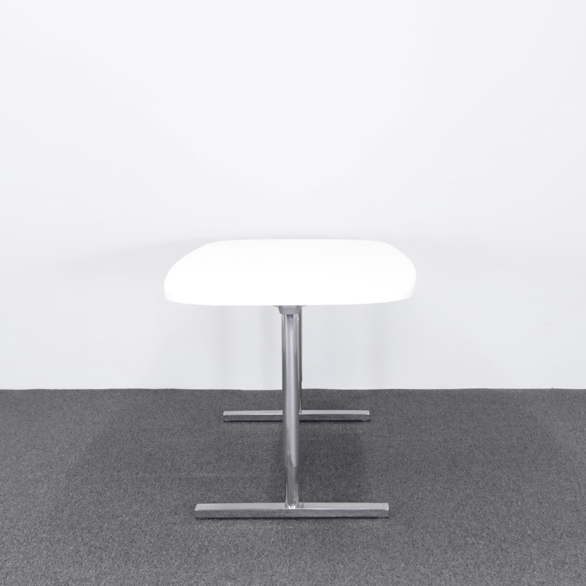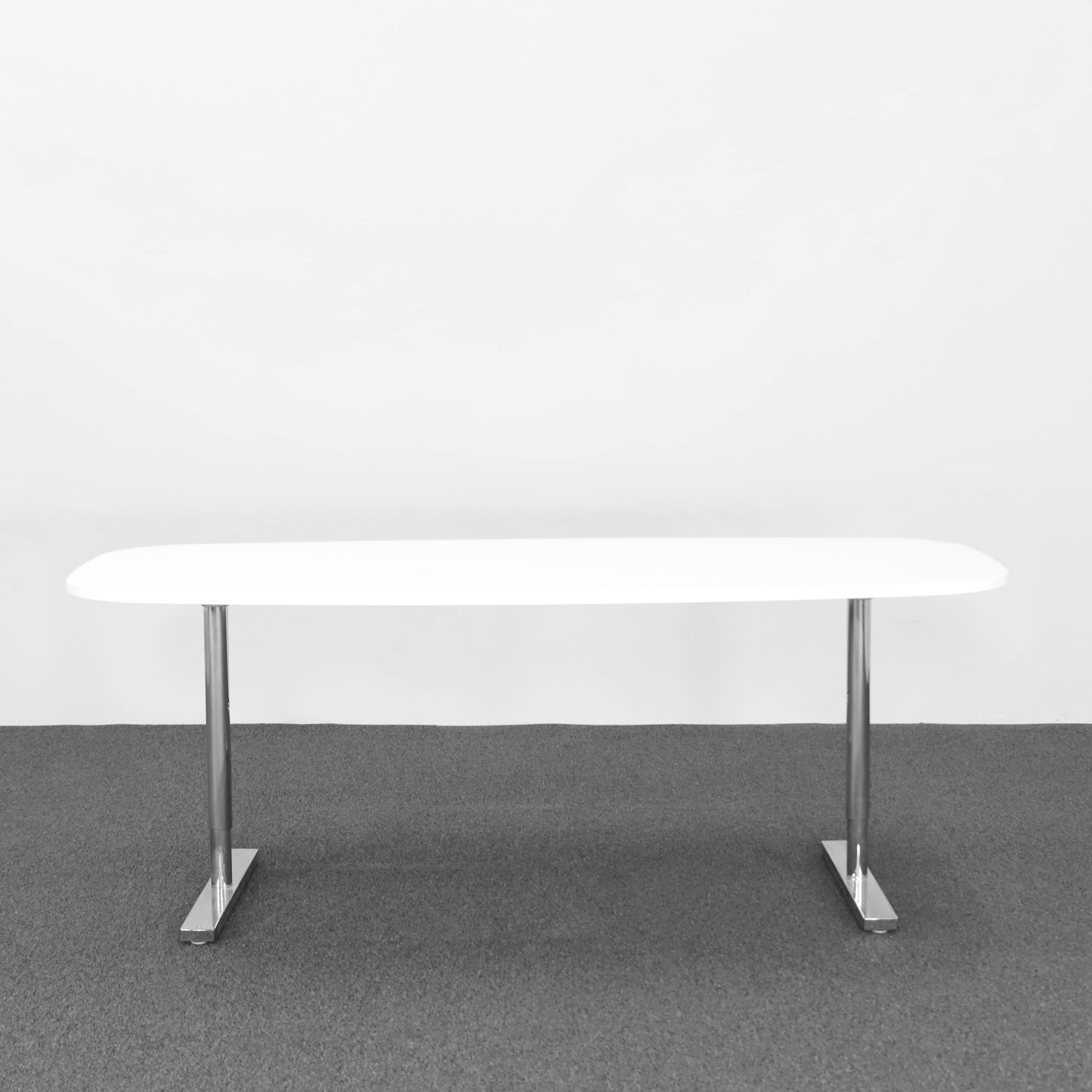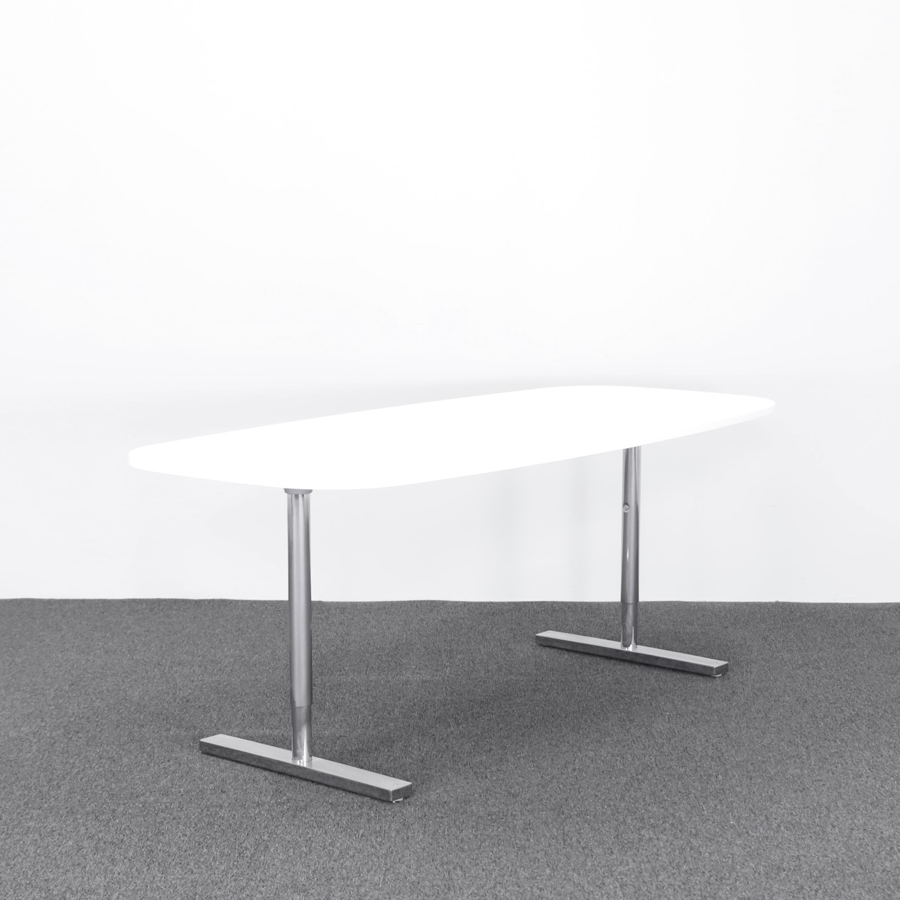 Detta nätta konferensbord från Martela, som även manuellt kan höjas och sänkas, ger rummet en effektiv arbetsyta samtidigt som det kromade T-stativet skapar en luftig känsla. Den lätt båtformade, vita skivan med rundande hörn ger ett mjukt och lätt intryck.