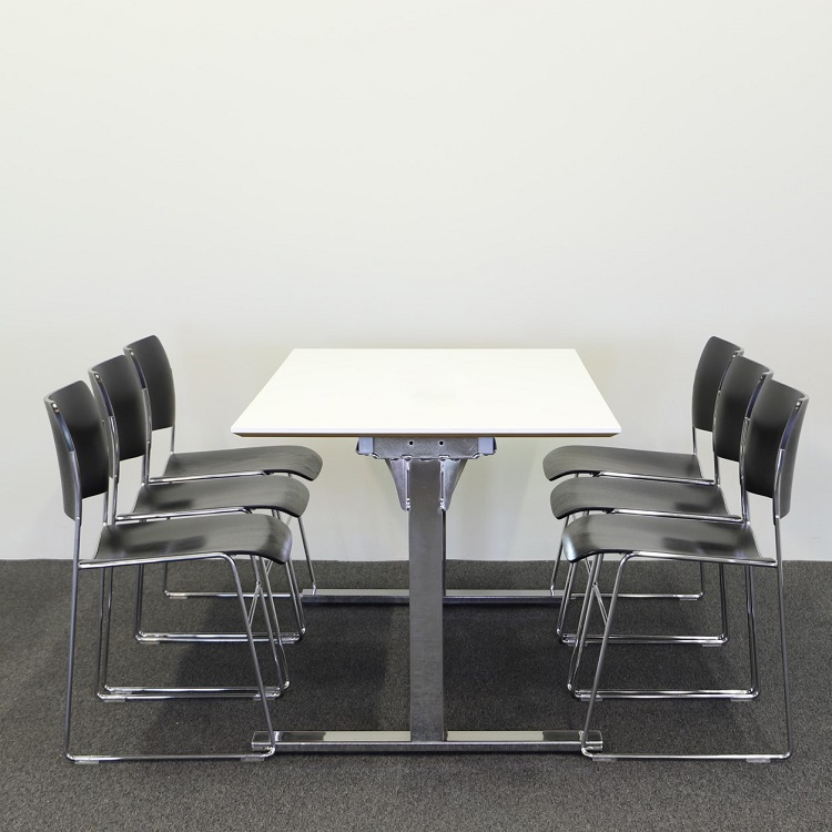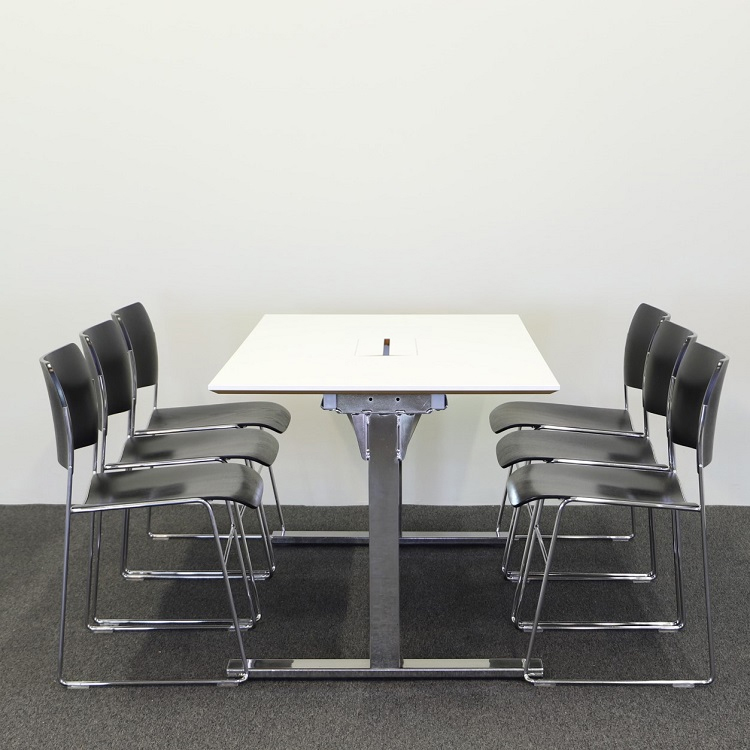 Trendsäkert mötesbord med vit bordsskiva och kromade ben.