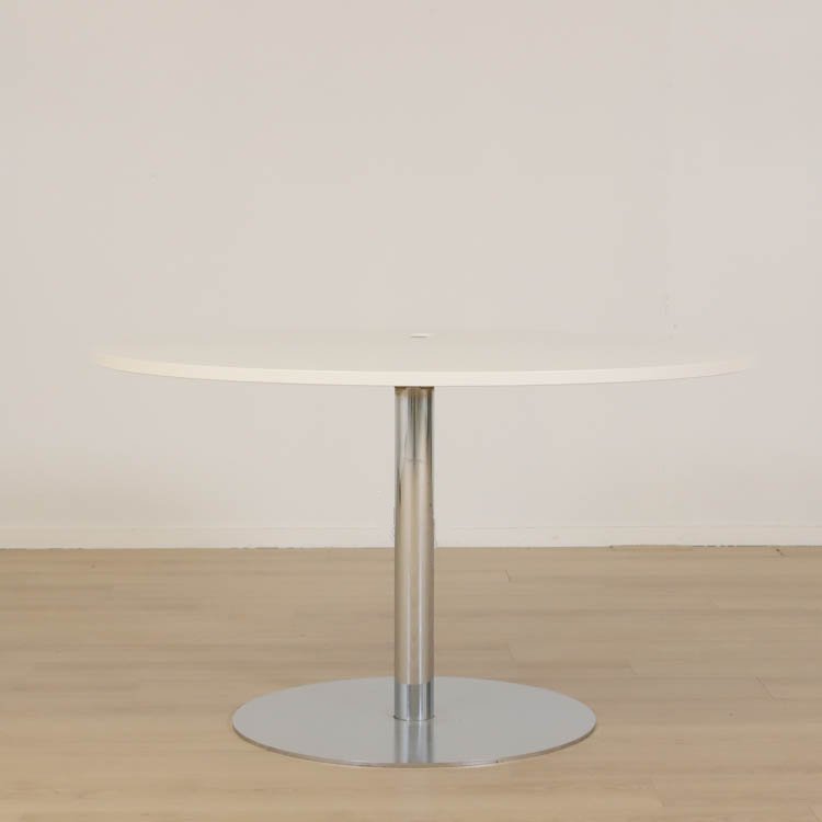 Det runda bordet i vitt med underrede i krom, erbjuder en elegant estetik som kommer att bli ett utmärkt tillskott i rummet. Med dess balanserade kombination av färger blir det en möbel som andas tidlöshet och hållbarhet. Bordets fot ger en stabil och pålitlig bas samtidigt som den skapar en distinkt kontrast mot det vita. Det runda formatet gör bordet perfekt för att skapa en avslappnad och inbjudande atmosfär där människor kan samlas runt och njuta av trevliga stunder tillsammans. Bordet finns med eller utan eluttag och kabelhål.