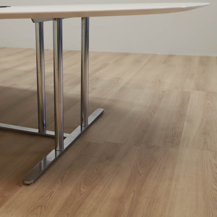 Bordet kommer i vitt på bordskivan och kromat stativ med t ben, detta ger en touch av modernitet och skapar en snygg kontrast till bordets övriga formspråk. Två praktiska kabelluckor integrerade i bordet erbjuder en lösning för smidig hantering av kablar och elektroniska enheter. Dessa kabelluckor ger en organiserad och professionell arbetsmiljö, samtidigt som de bevarar bordets rena och stilrena utseende.