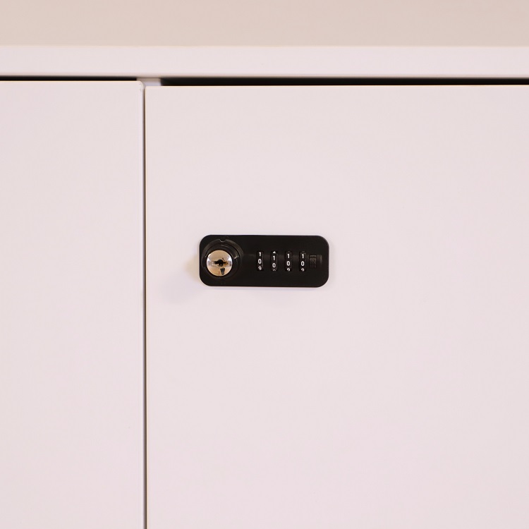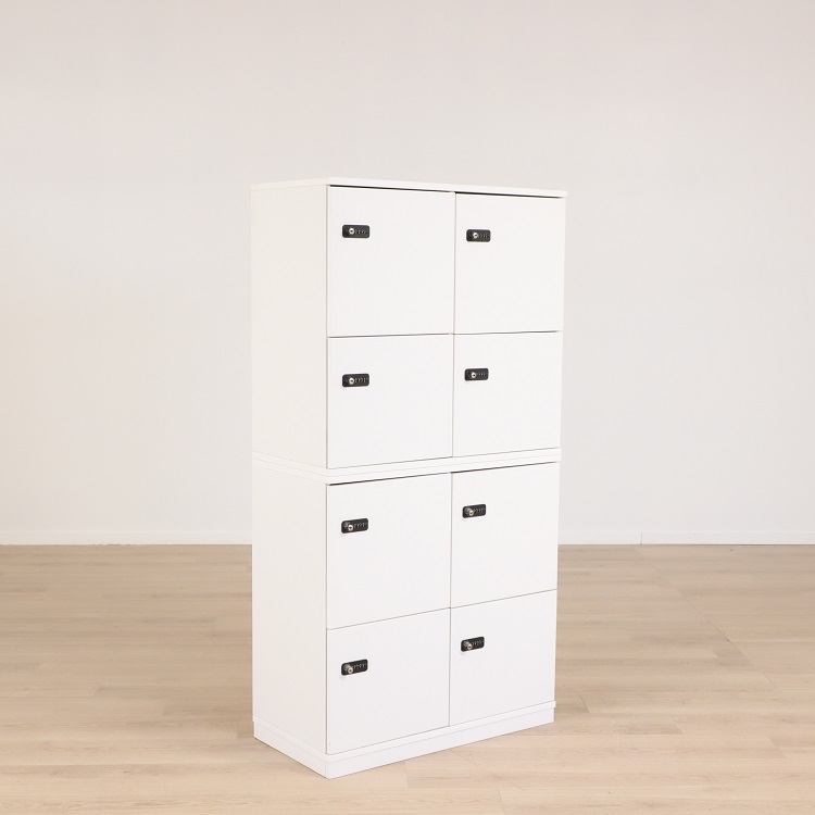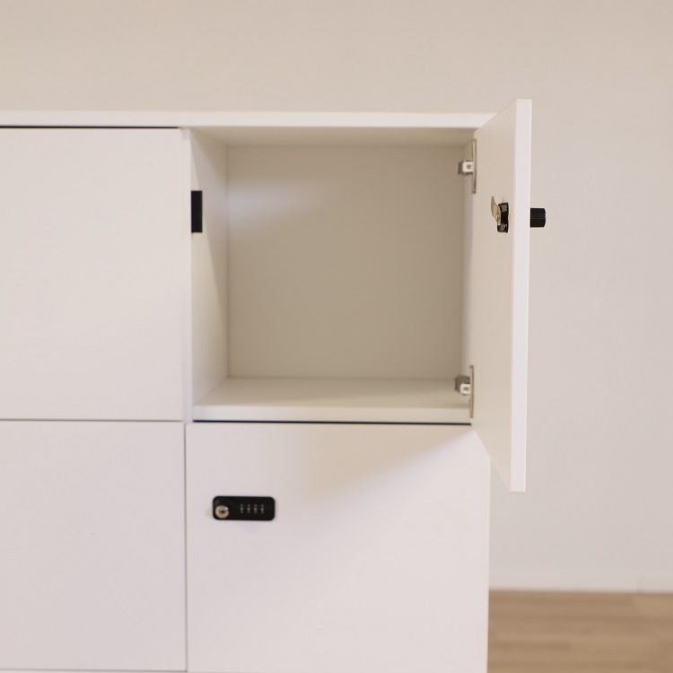 Det finns åtta låsbara fack per personalskåp, perfekt för omklädningsrum, kontor eller klassrum. Skåpen låses enkelt med kodlåsen. Personalskåpen Space kommer i helvitt utförande med svarta kodlås.