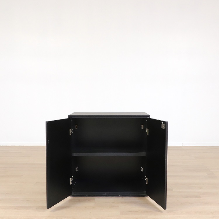 En stilren och praktisk förvaringslösning i form av en svart, låg enhet med rymliga två hyllplan. Hyllplanen kan enkelt förflyttas efter behov och ger gott om utrymme för att organisera böcker, dekorationer, elektronik eller andra nödvändigheter. Förvaringsskåpets låga utförande gör att de även kan placeras under fönster intill väggen, perfekt för begränsade utrymmen. Skåp i plåt har god hållbarhet och passar därför perfekt till kontor och andra offentliga miljöer, där möblerna brukas i stor utsträckning.