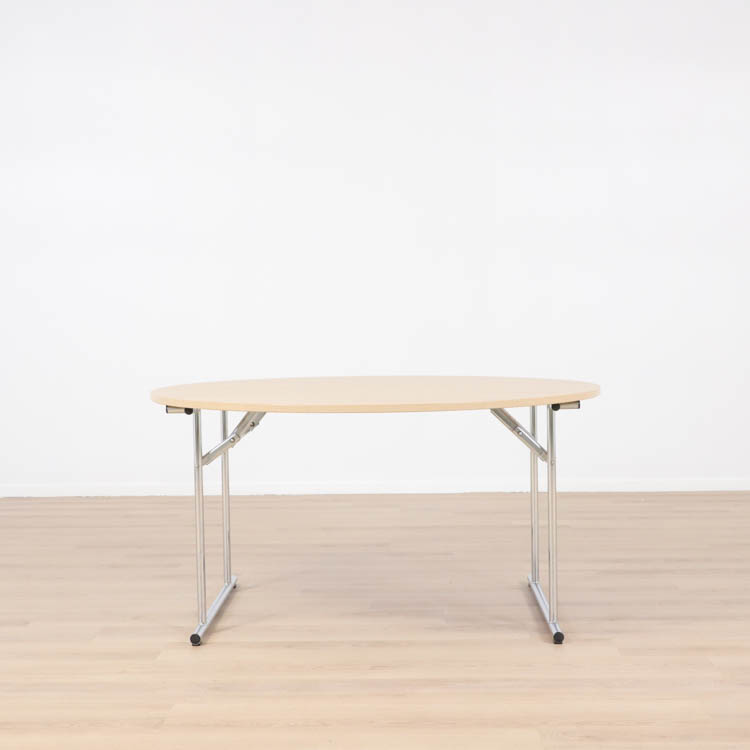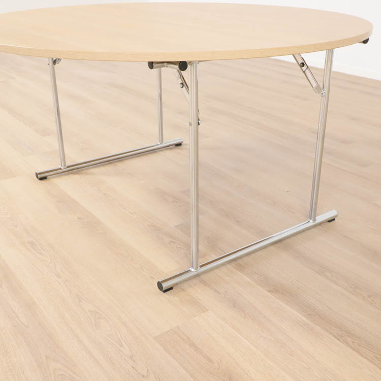 En naturlig skiva pryder dess topp, vars varma toner och ådringar skapar en inbjudande atmosfär. Undertill förkromade stabila ben som är fällbara. Denna flexibilitet gör det till det perfekta valet för både små och stora utrymmen, där det kan anpassa sig efter olika situationer och behov.