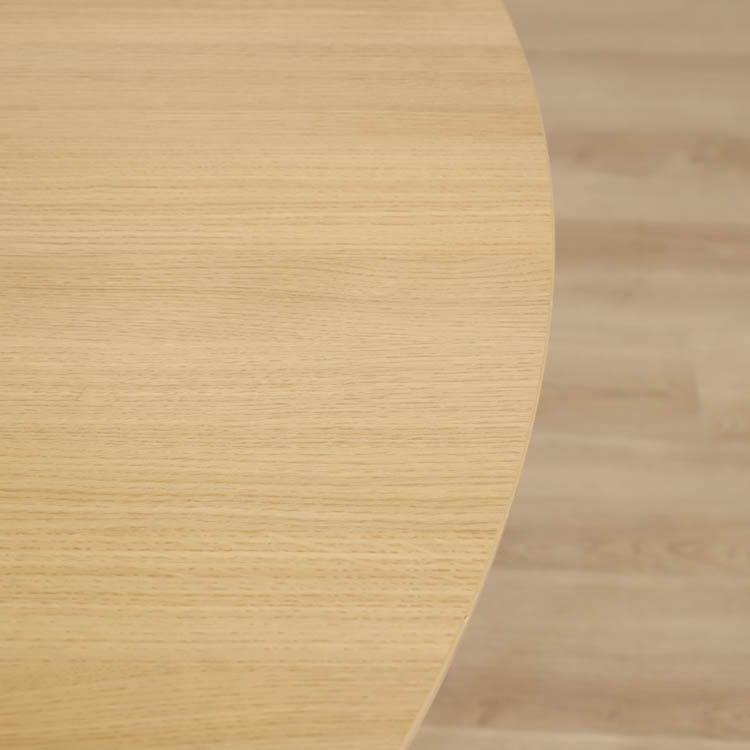 Ett runt bord, både funktionellt och elegant i sin design, står i centrum av rummet. Detta bord är tillverkat för att förena praktisk användning med enkel svensk design av Johansson Form.