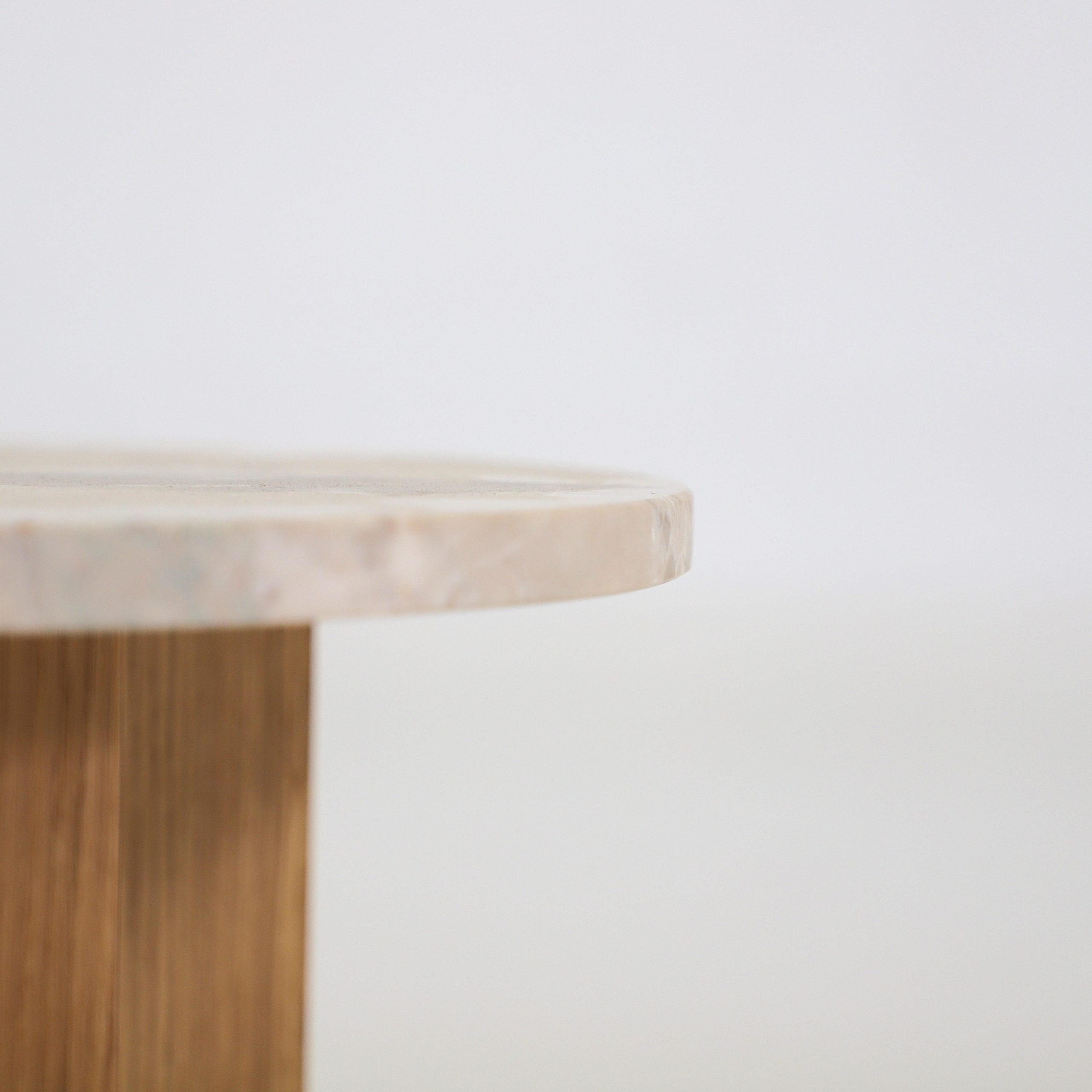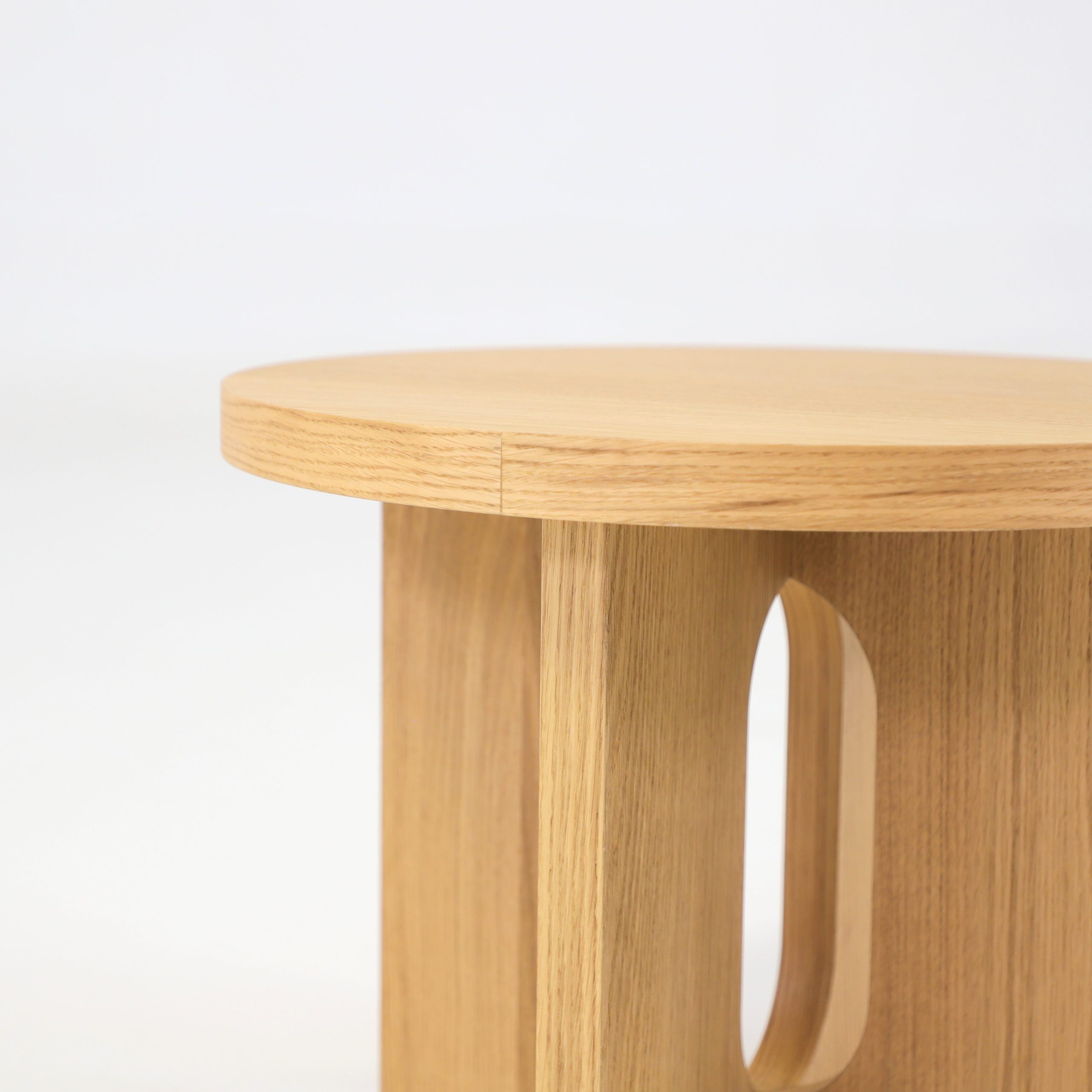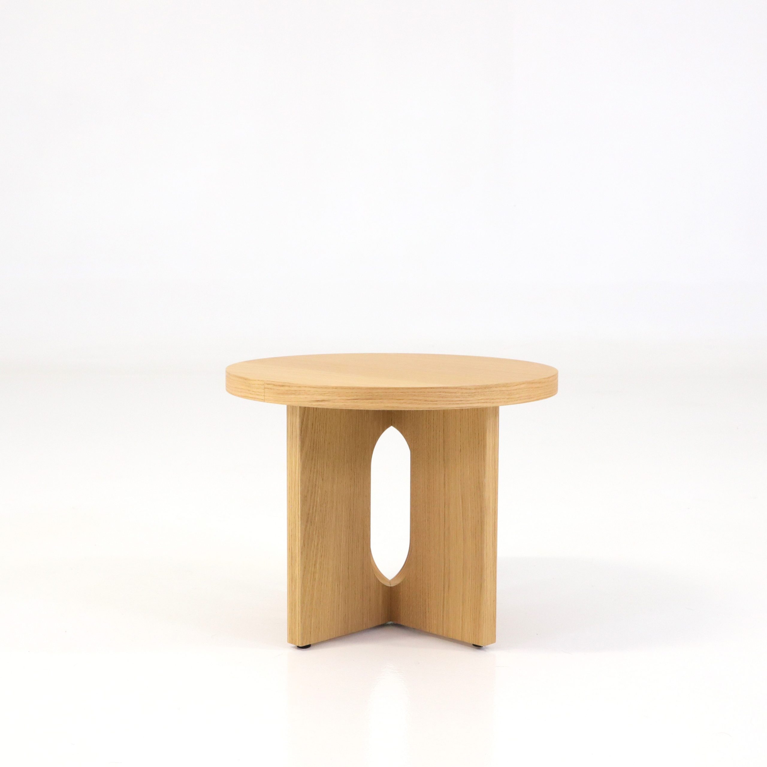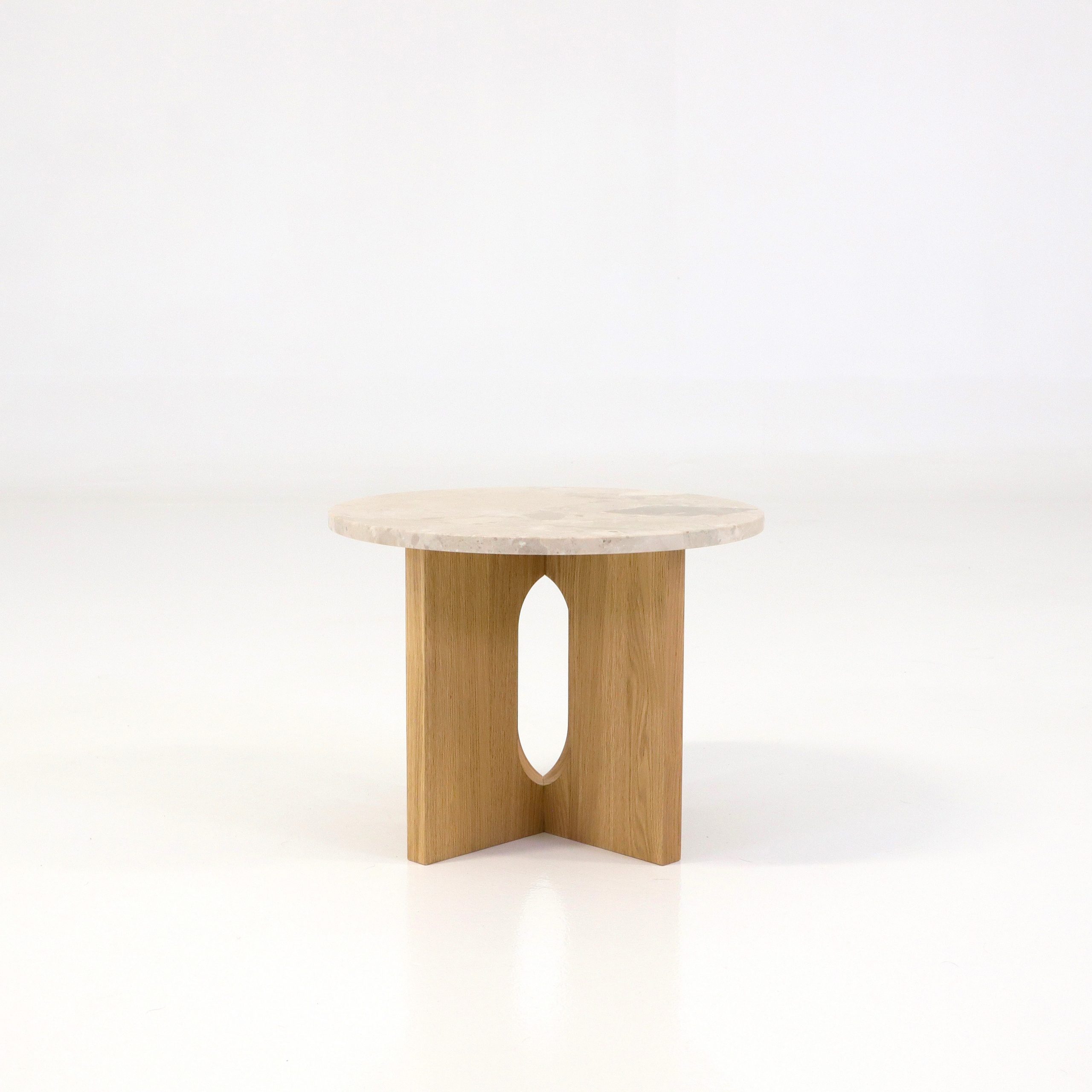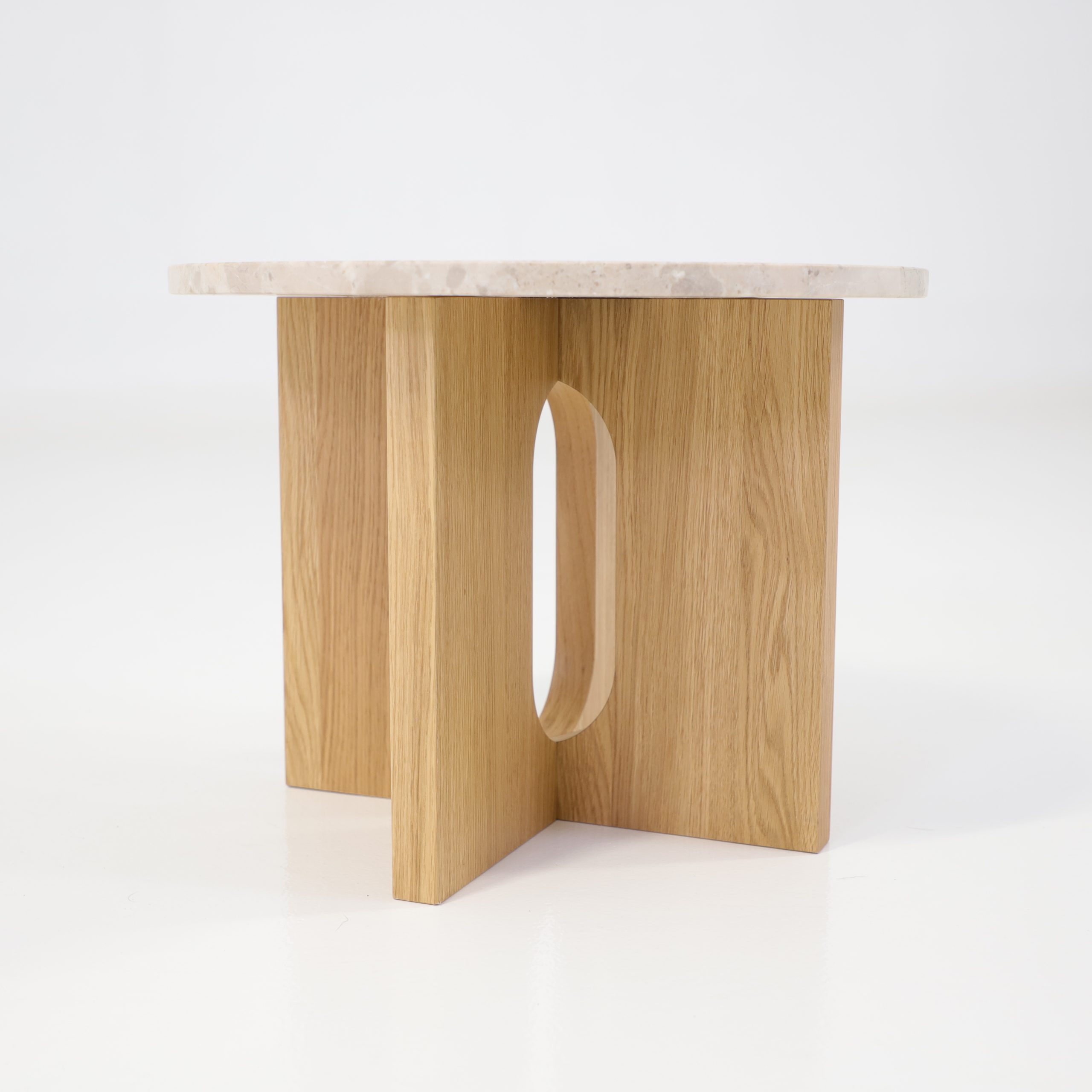 Upplev balansen mellan robust form och mjukt uttryck i Sidobord Androgyne , designad av norska arkitekten Danielle Siggerud för Audo Copenhagen. Bordsskivan finns valbar i två varianter, Ek eller Marmor.den runda skivan vilar nätt över en bred, minimalistisk ekbas vilket skapar en elegant kontrast mellan det nätta och robusta.