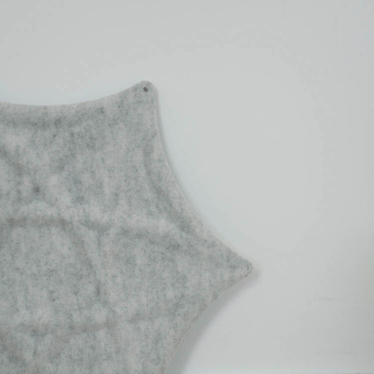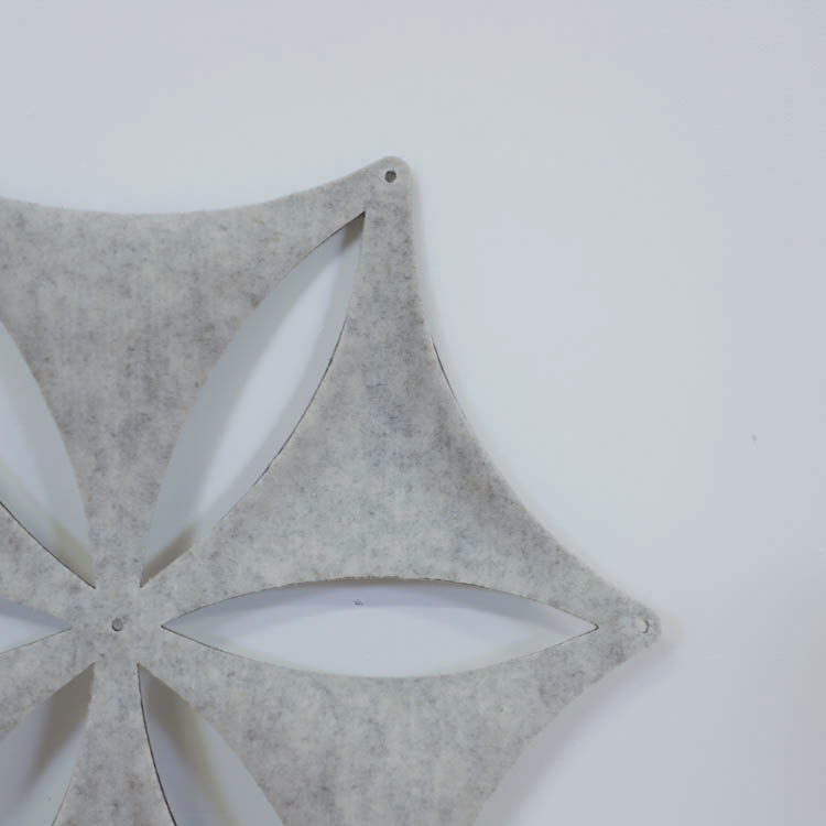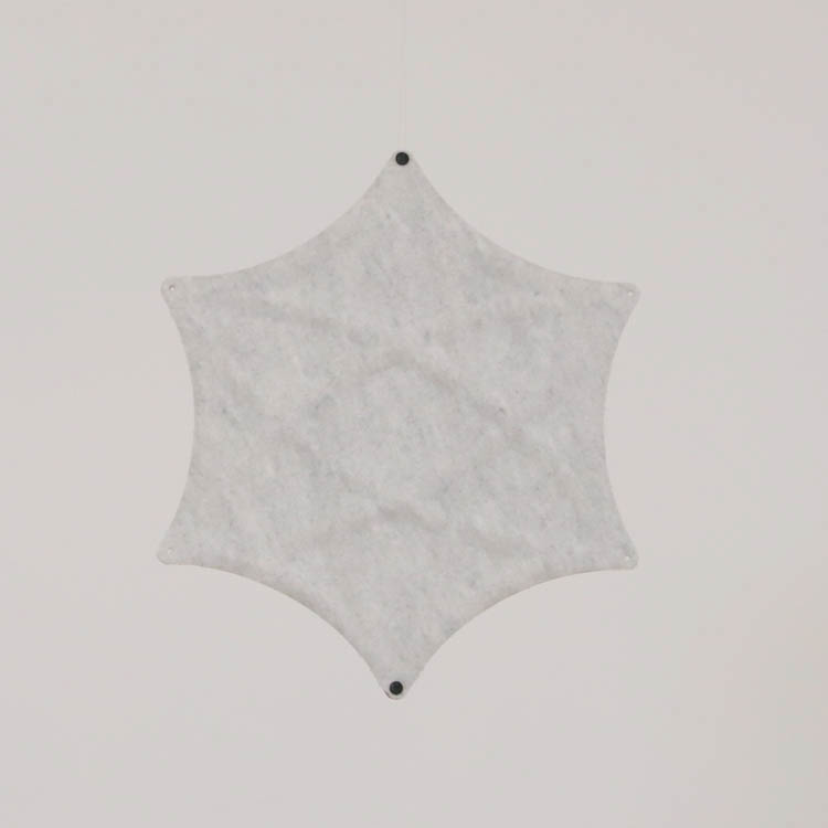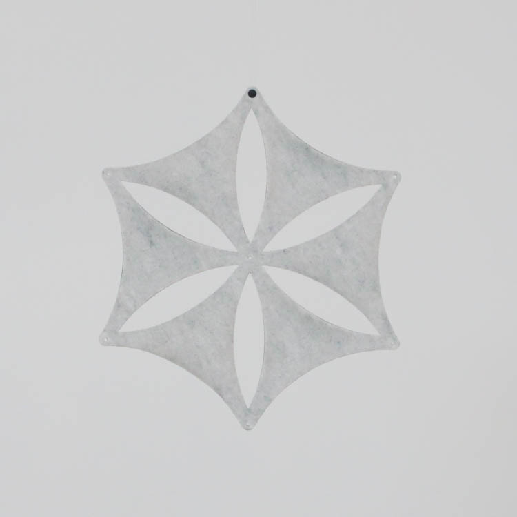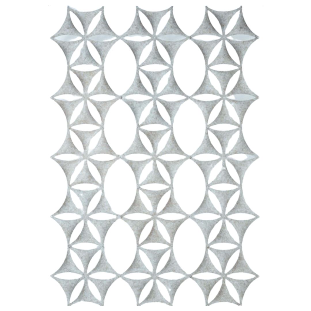Skärmvägg i ljust grå med snöflingsinspirerat mönster från Abstracta. Den här skärmväggen upplevs som lätt och svävande eftersom den inte har några kraftiga ben och fötter, utan fästs i skenor i taket. Eftersom skärmväggen är gjord av formpressad filt dämpar den ljud och tack vare sitt mönster släpper den igenom mycket ljus. Design av Stefan Borselius.