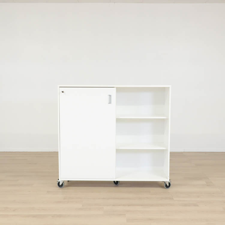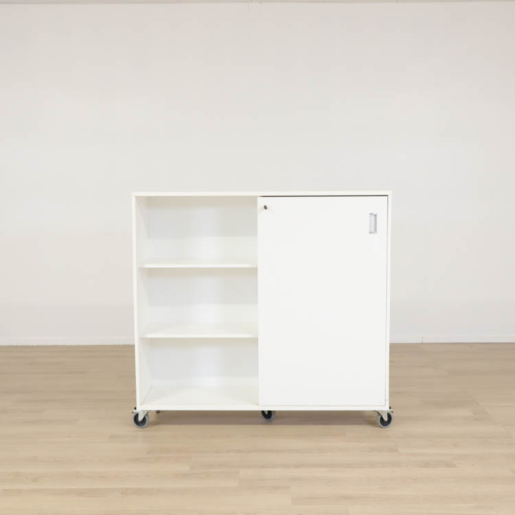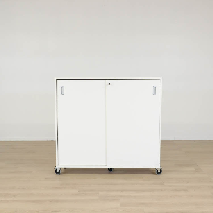 Ett smidigt förvaringsskåp med skjutdörrar vilket gör att du inte behöver mycket utrymme framför skåpet för att kunna öppna dörrarna. Skåpet har tre hyllplan med plats för kontorstillbehör och lås vilket gör att du kan bevara privata papper. Tack vare hjulen kan du enkelt flytta skåpet vid behov. Skåpet finns även utan hjul med måttet 120x41x93 cm.