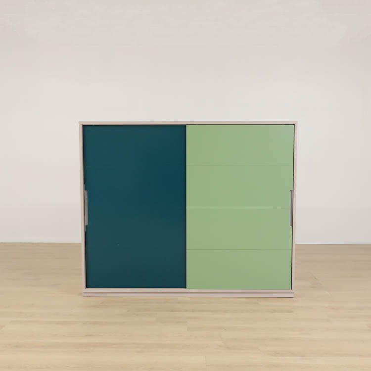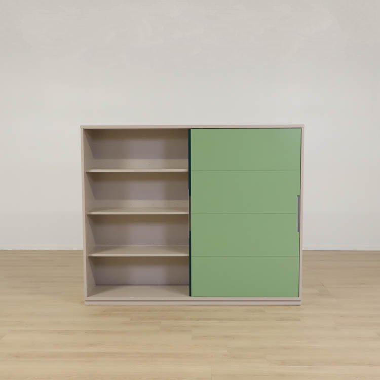 Skjutdörrsförvaring från Edsbyn i nyanser av grönt och beige med praktiska skjutdörrar och diskreta handtag. Här kan du organisera pärmar, viktiga papper och annat kontorsmaterial och förvara dessa på bästa sätt. Du kan också använda skåpet till att skärma av runt arbetsplatser för att skapa mer avskildhet eller som rumsavdelare i öppna landskap.