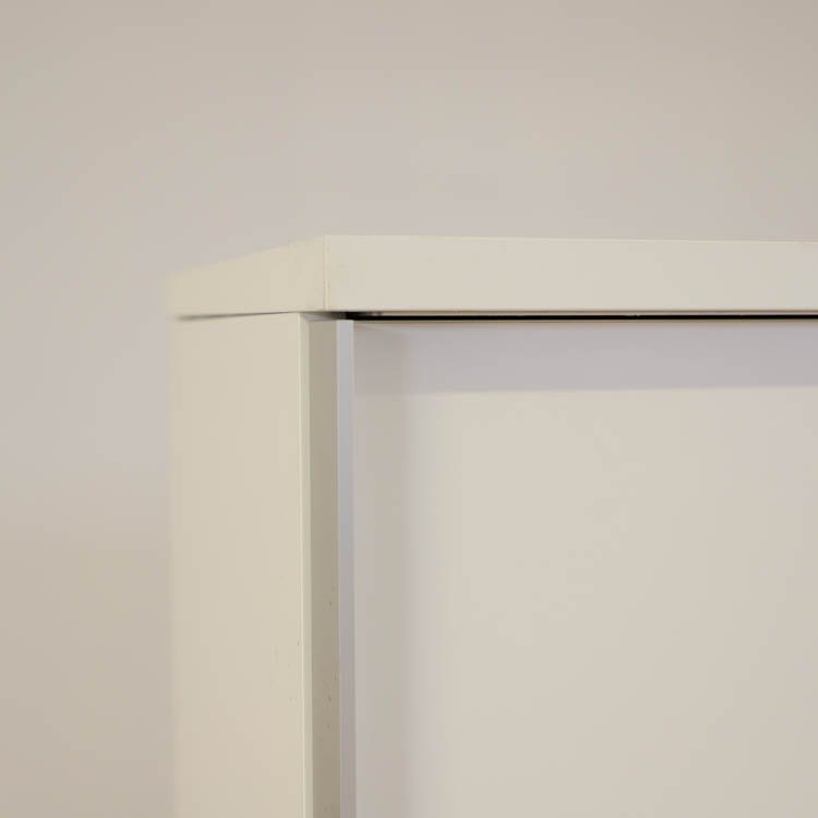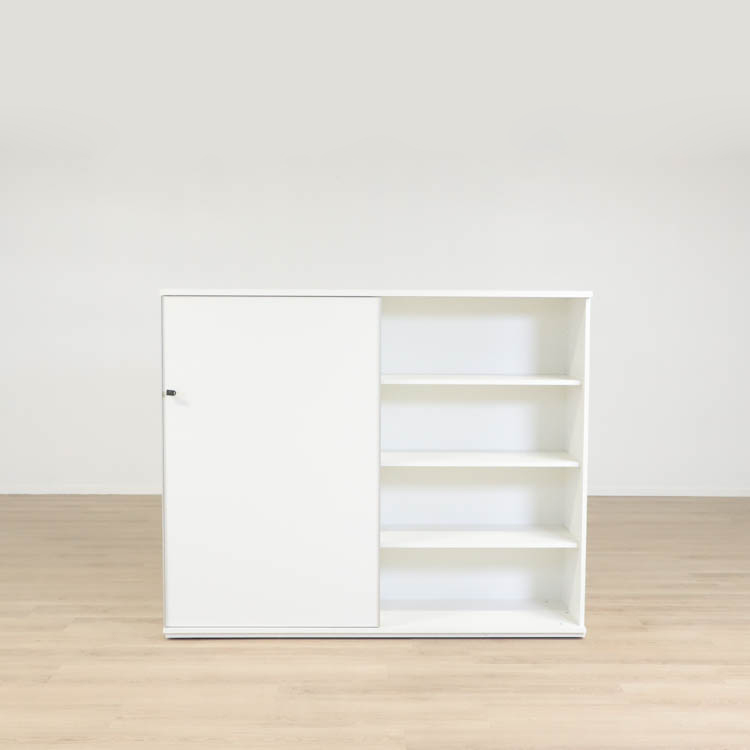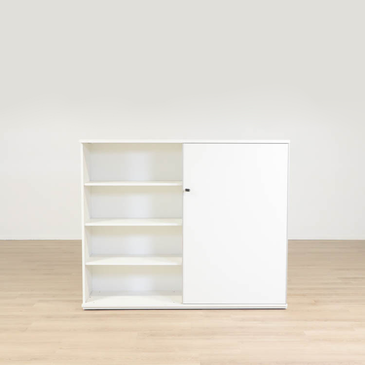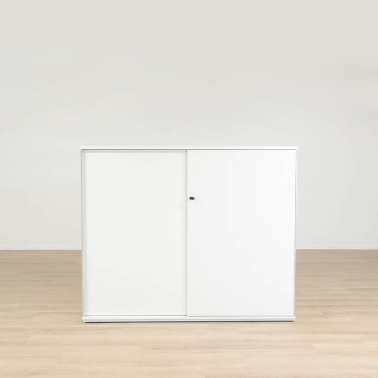 En stilren förvaringsserie från Ragnars Work med skjutdörrar som effektivt spar utrymme på kontoret men ändå erbjuder generöst förvaringsutrymme. På vardera sida finns hyllplan med perfekt uträknat utrymme att förvara kontorstillbehör på ett snyggt och ordningsamt vis. Som alltid levererar Ragnars hög kvalitet och det här skåpet har en slittålig vitlaminerad yta och aluminiumkanter på dörrarna.