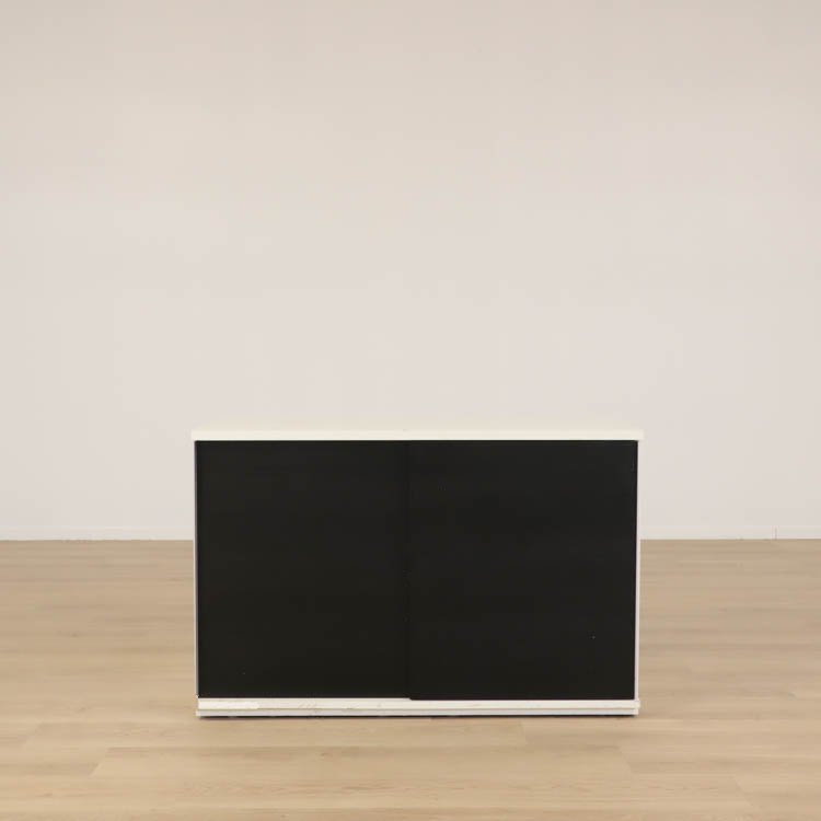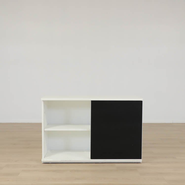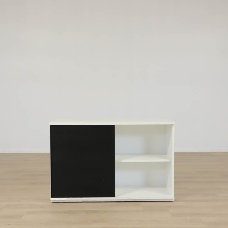 Den låga skjutdörrsförvaringen i vitt med svarta dörrar erbjuder en modern och stilren lösning för ditt förvaringsbehov. Kombinationen av vitt och svart ger ett elegant och kontrasterande utseende, som kan bli ett iögonfallande inslag i ditt hem eller kontor. Denna typ av platsbesparande möbel passar särskilt bra i minimalistiska och moderna interiörer där ren design och funktionalitet står i fokus.