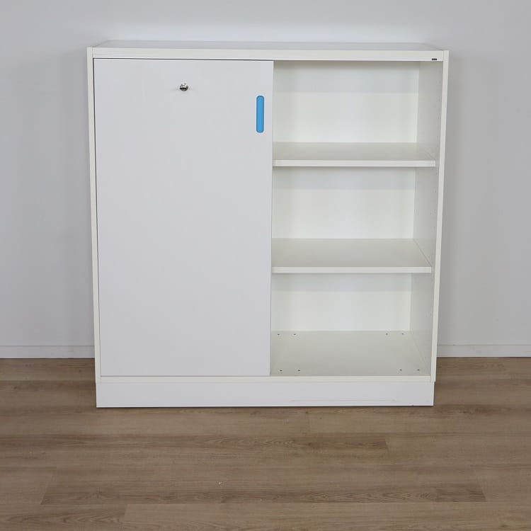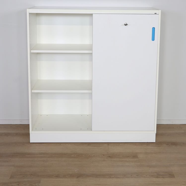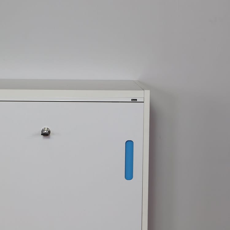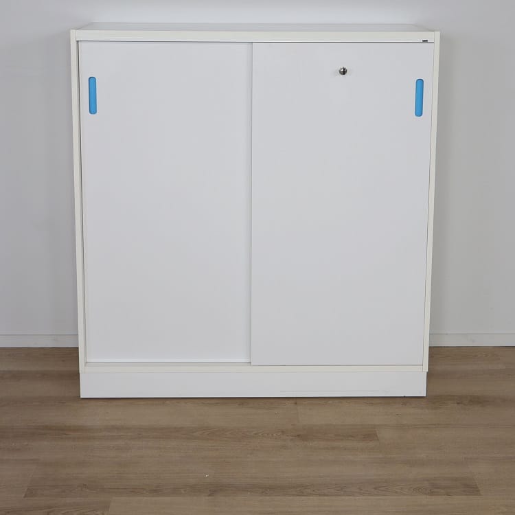 Den robusta stommen samt dörrar har en slittålig vacker vitlaminerad yta som tillsammans med de blåa handtagen ger skåpet en livfull känsla. Skjutdörrsförvaringen finns med nyckel som gör det enkelt att låsa in värdefulla dokument och material.