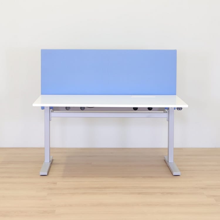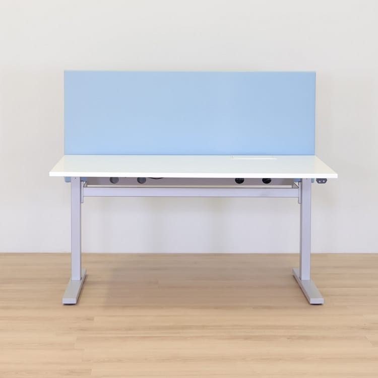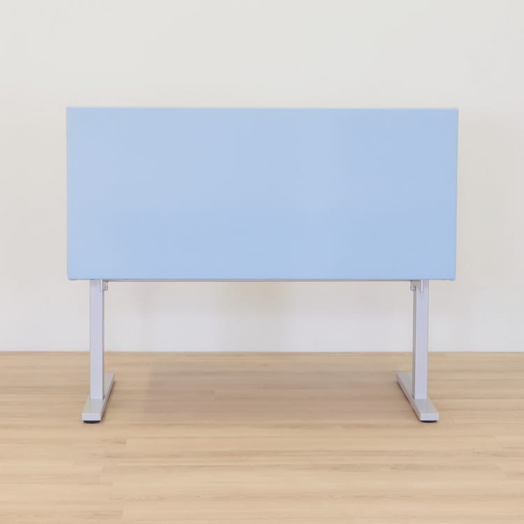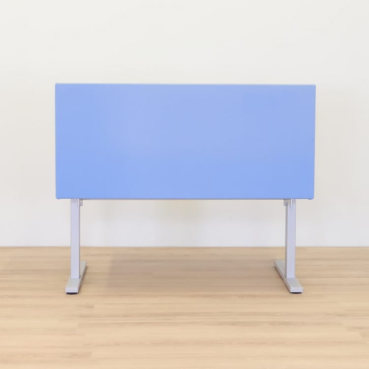 Skrivborden med ljusblå och mörkblå bordskärm med skick 2/5 har estetiska avvikelser i form av solblekt tyg.