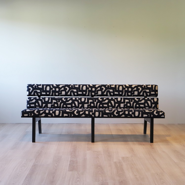 Denna soffa är omlackerad samt klädd i helt ny klädsel med tyget “Letters” från Lauritzon.