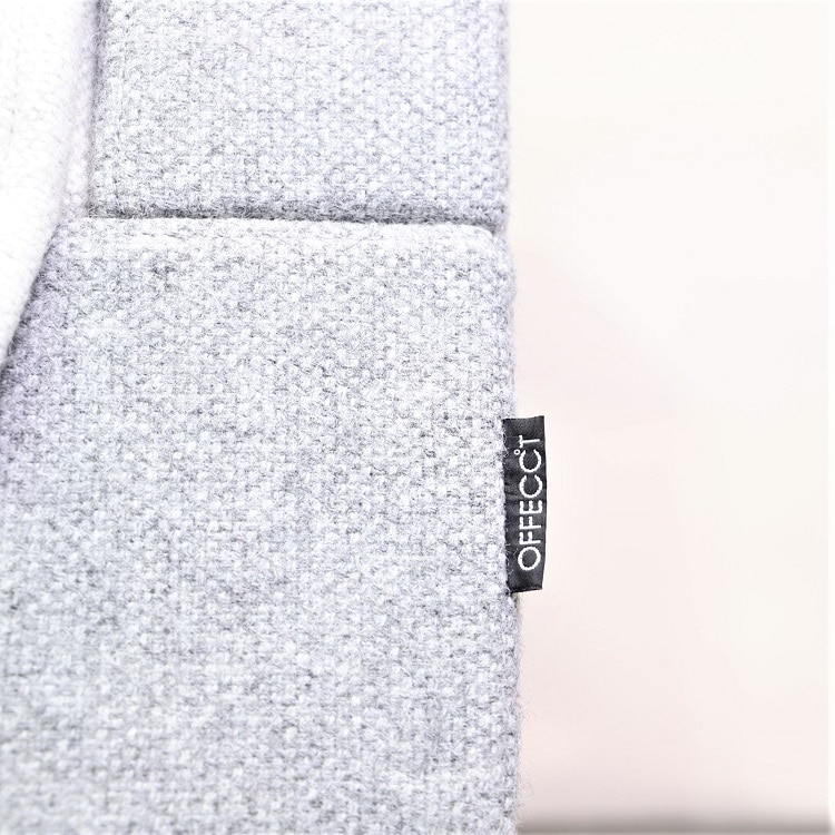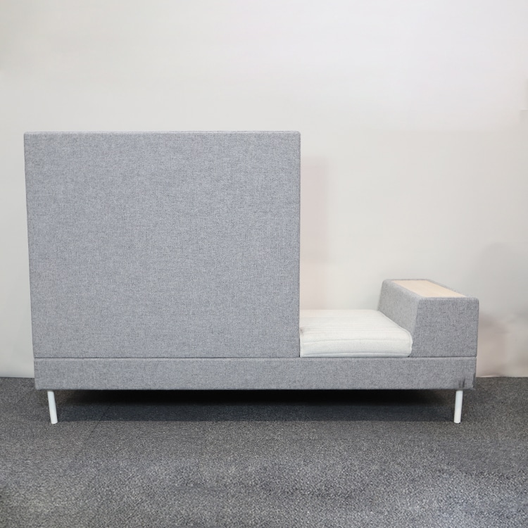 Grå soffa med hög rygg och lådformat armstöd designad av prisbelönade Ineke Hans för Offecct. Den här modellen har quiltad tygklädsel som sits och vita metallben. Armstödet kan användas för att ställa av sig en kaffekopp, handväska eller andra saker man vill ha nära sig. Perfekt för ytor där man vill ha en avskärmad möbelgrupp eftersom ingen kan tjuvkika bakom det höga ryggstödet.