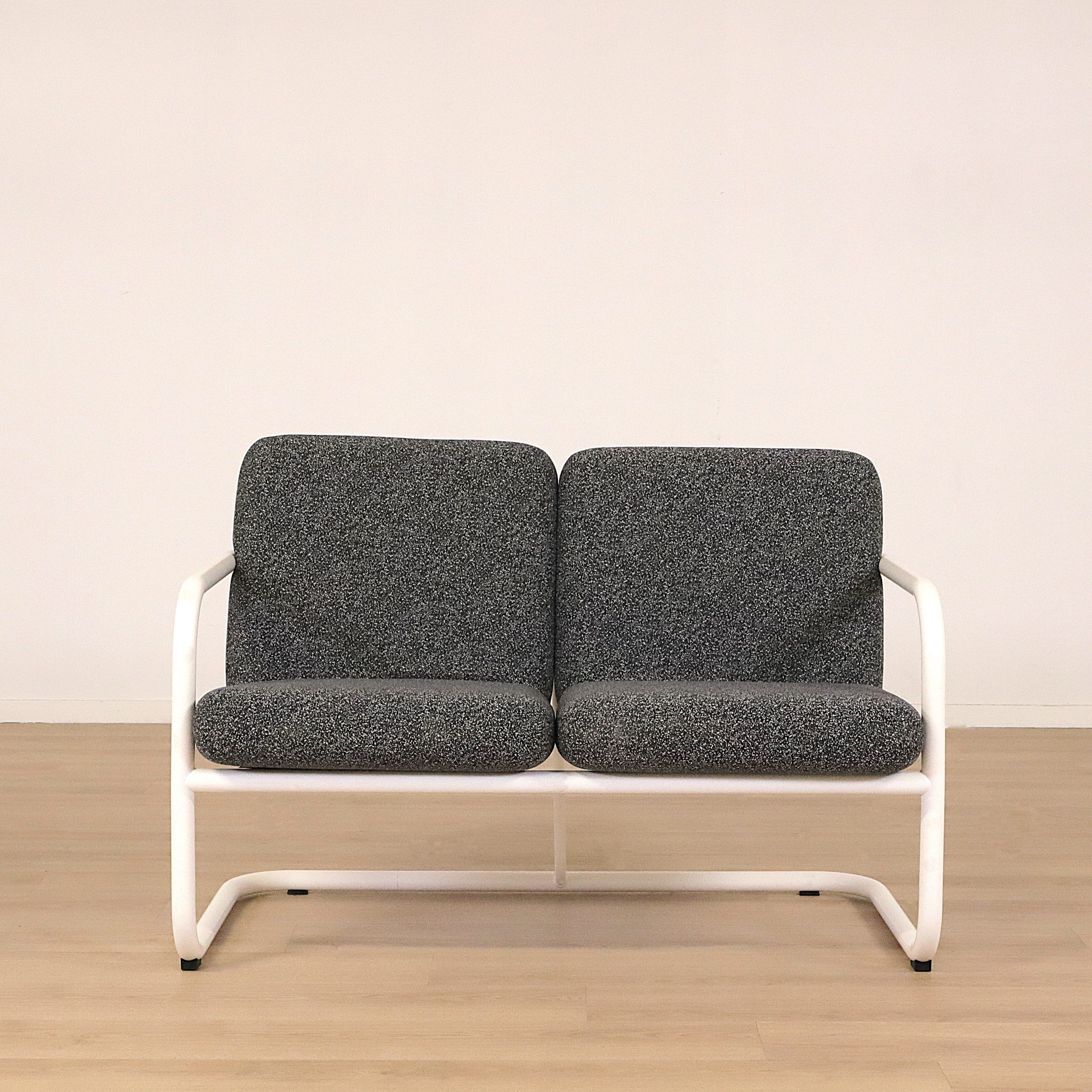 Soffan har en stadig stomme av pulverlackat stål samt dynor klädda i mörkt melerade toner.