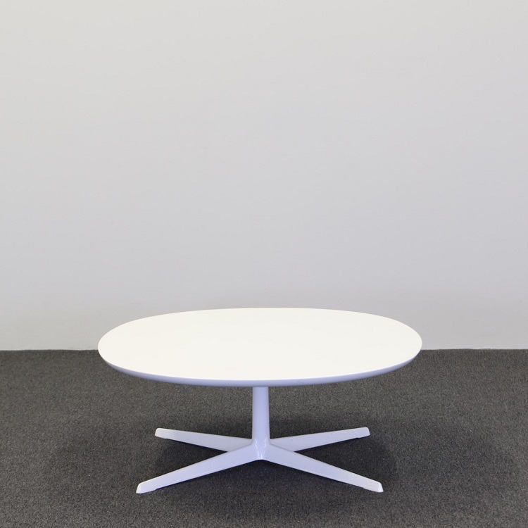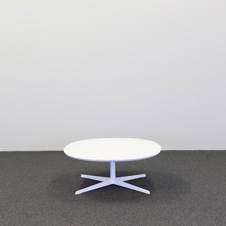 -Här har ni ett soffbord värdigt en större soffgrupp. Den stilrena, eleganta utformningen i helvitt utförande, där 4-stiftsbasen som grund kompletteras av en oval vit skiva toppad med slagtålig strukturlack, ger rummet en krispig känsla och lätthet. Laminat är särskilt slitstarkt och lätt att underhålla, varför bordet lämpar sig väl för offentlig miljö.