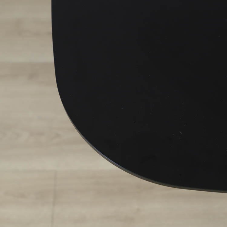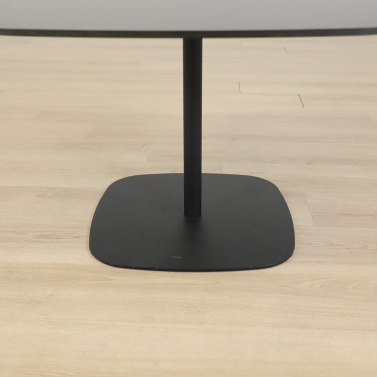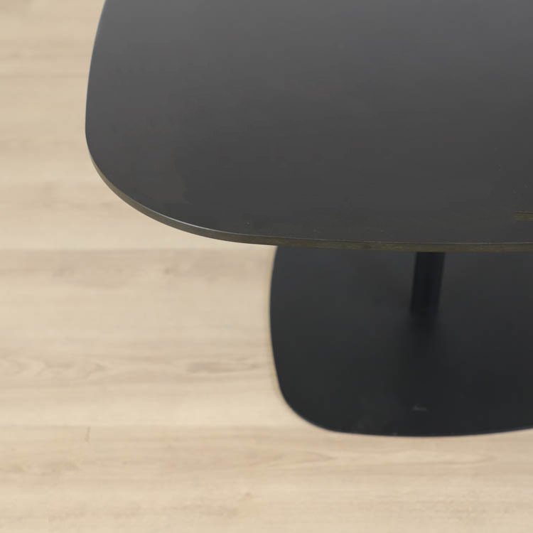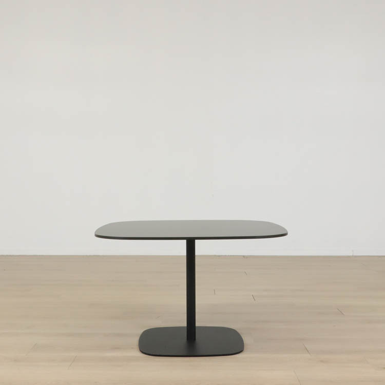 Bordsskivan och foten har kvadratisk utformning med rundade hörn som ger en fin kontrast mot den kaxiga, svarta kulören. Nobis bordsskiva är tillverkad i svart genomfärgad MDF som tillsammans med den strukturlackerade foten ger bordet hög hållbarhet och gör sig därför väl i offentliga utrymmen.