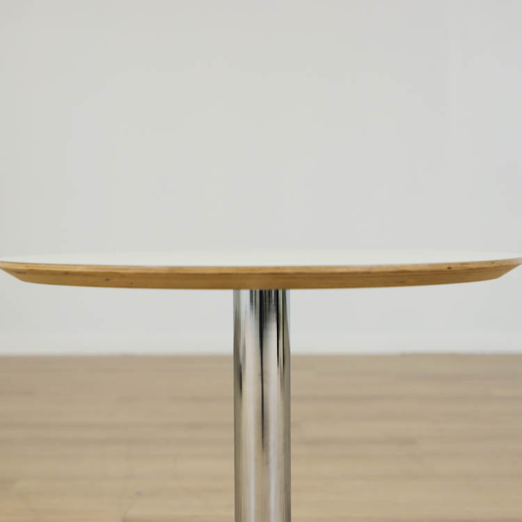 Understöd av en pelarfot i krom förstärker bordets minimalistiska design. Den blanka, kromade foten ger inte bara en estetiskt tilltalande kontrast till den vita skivan, utan också en stabil bas som säkerställer att bordet står stadigt på plats. Pelarens smala och eleganta profil bidrar till ett luftigt och lätt intryck, vilket gör att bordet känns nätt och inte tar upp mer plats än nödvändigt.