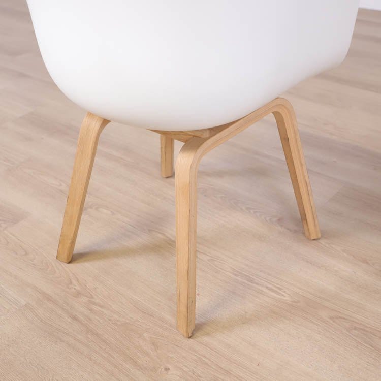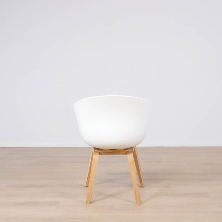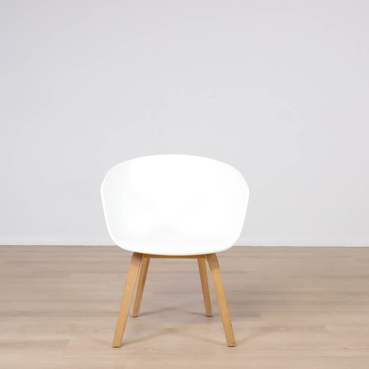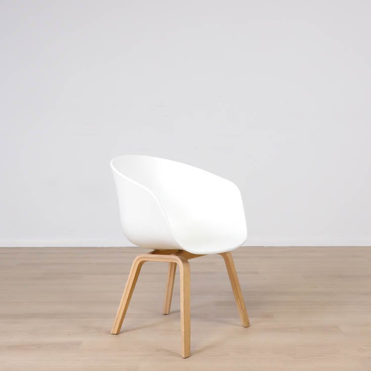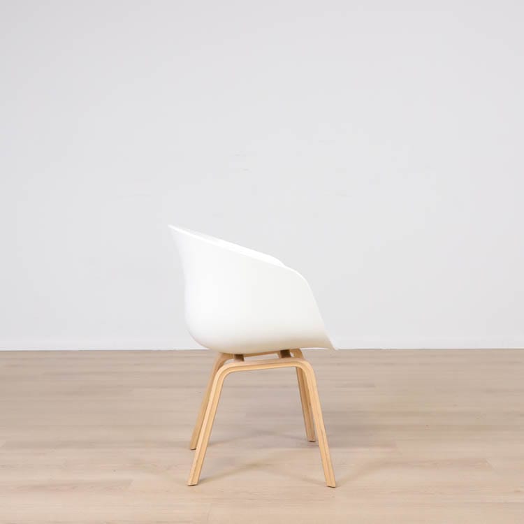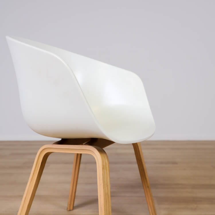 Modellen About a Chair kommer från det danska varumärket HAY och är designad av Hee Welling. Tanken bakom designen var att göra en stol med ovanligt enkel design som passar i princip var som helst. En bekväm och stilren stol med rena linjer i plast med ben i bokplywood med klarlackad ekfanér. Detta utförande i vitt med träben.