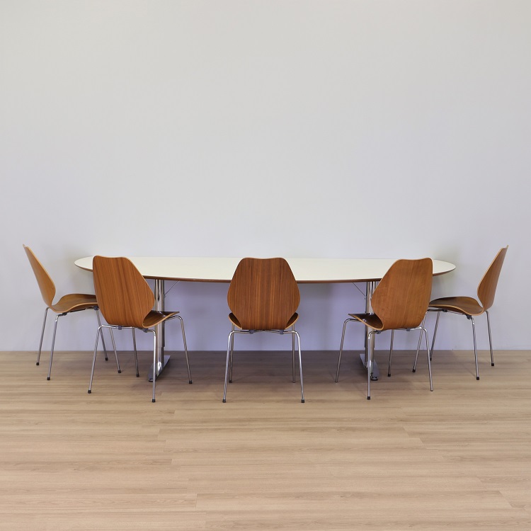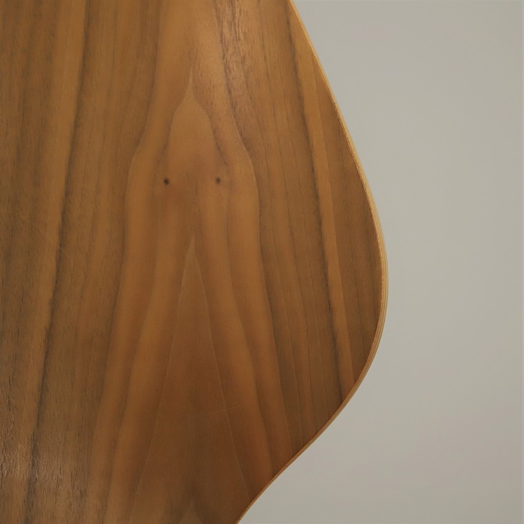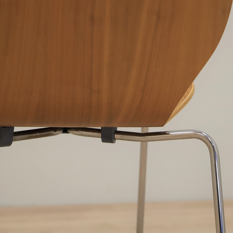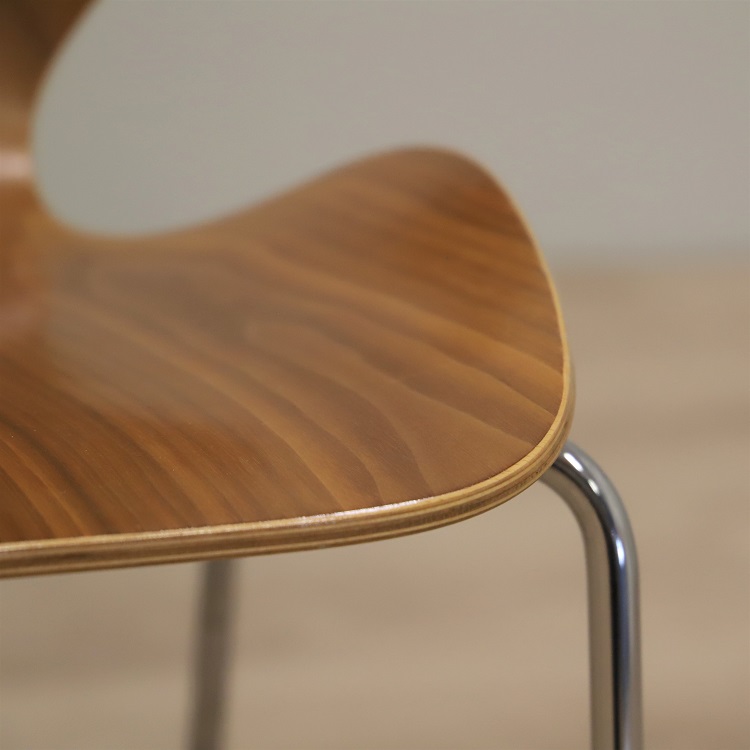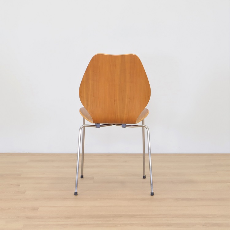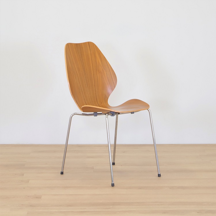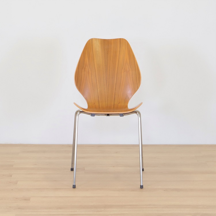 Stolens rygg och sits i trä ger ett välkomnande och hemtrevligt uttryck, som tillsammans med de kromade benen ger stolen dess elegans och tidlös design. Sits och rygg har mjuka linjer och är lätt välvda för att ge fint stöd vid ryggen samt benen, vilket i sin tur ger stolen god komfort.