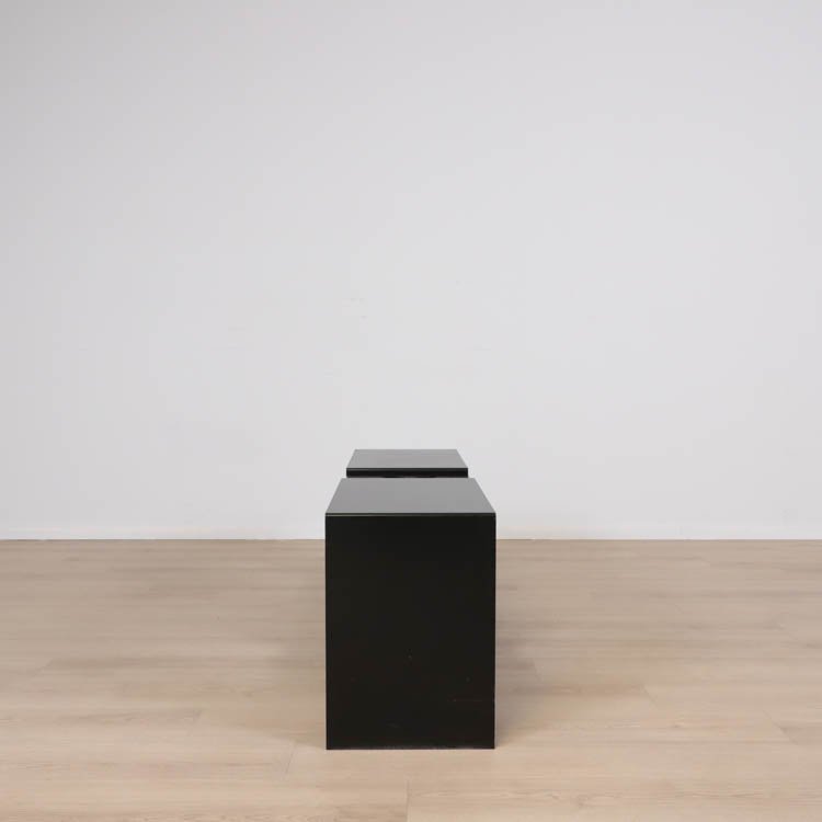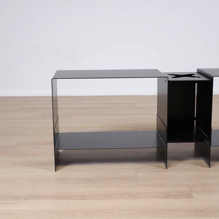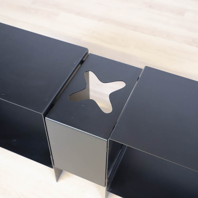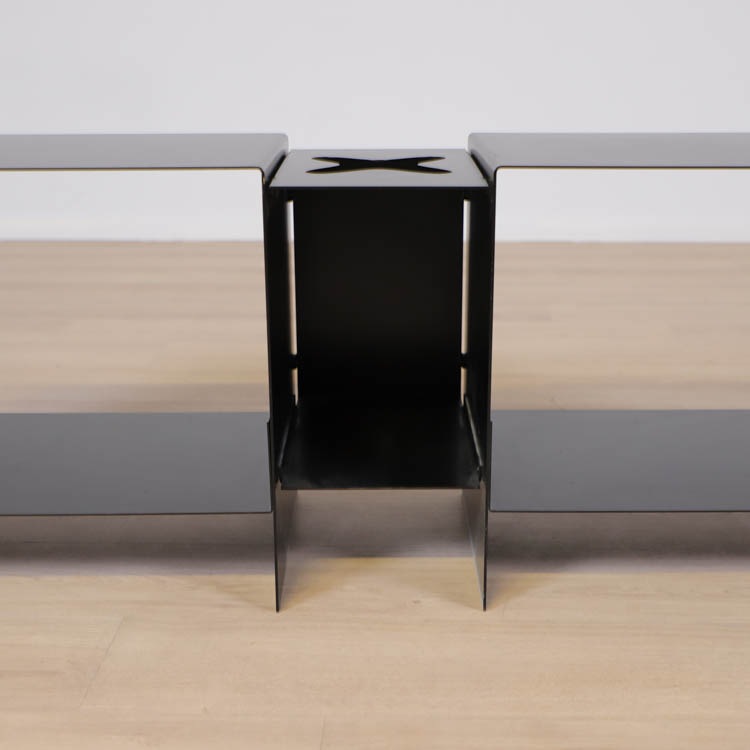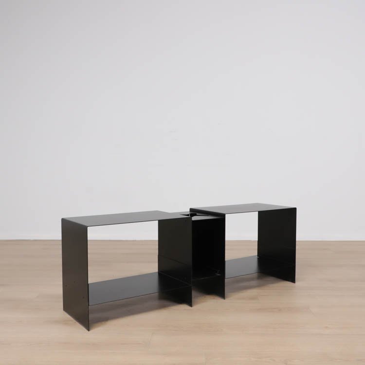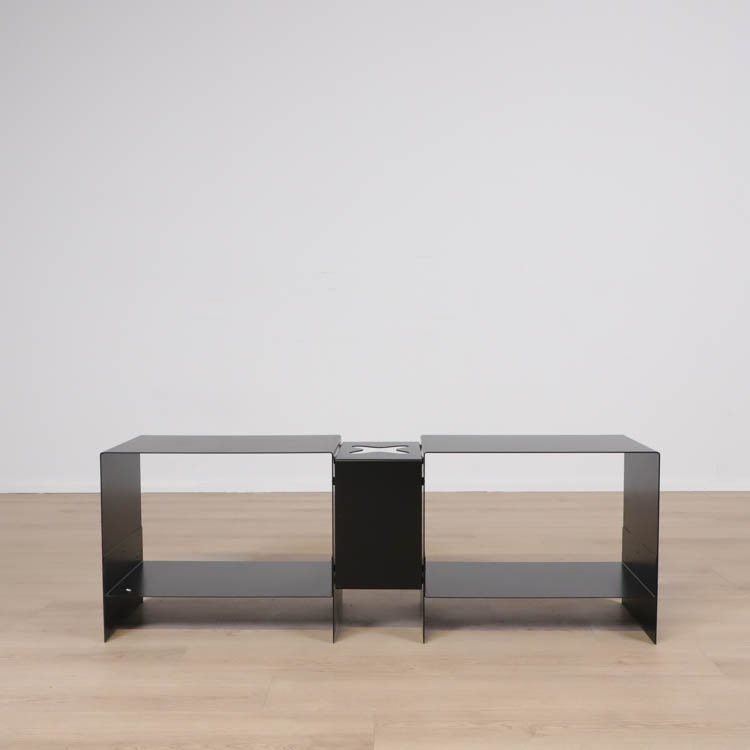 Det svarta stålbordet är en funktionell och robust möbel, denna med dubbla bord som sitter ihop med en avlastningsyta i mitten med hål. Här kan du exempelvis förvara paraply eller dylikt om möbeln används i en entré.