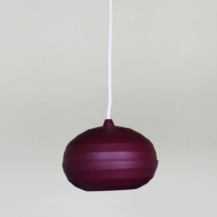 Lila taklampa i form av en pendel med vit sladd. Taklampan Pomi från Zero är designad av den italienska formgivaren Luca Nichetto. Ordet pomi använder man på venetianska för att definiera äpplen och frukt, och visst kan man tänka sig att tankarna förs till just frukt när man ser den här pendeln hänga från taket.