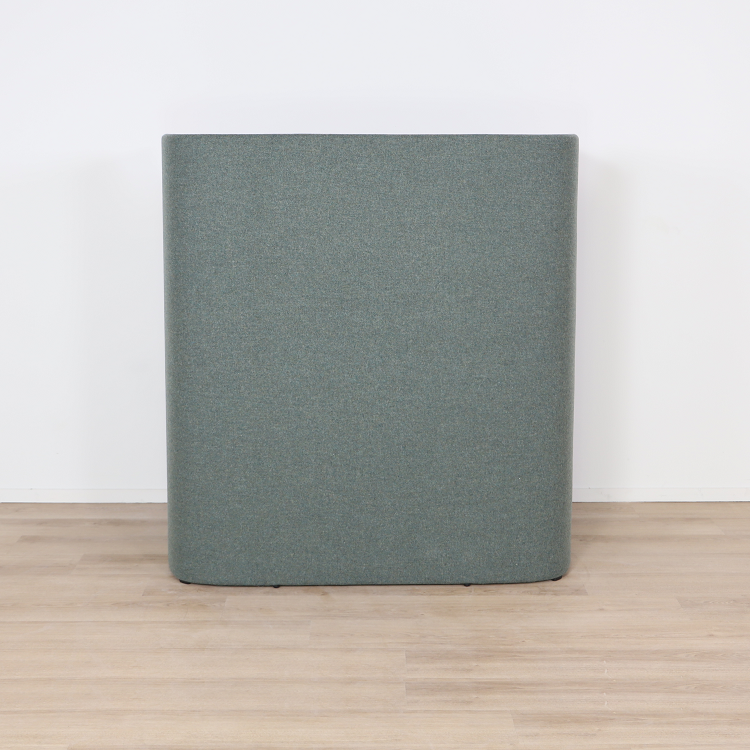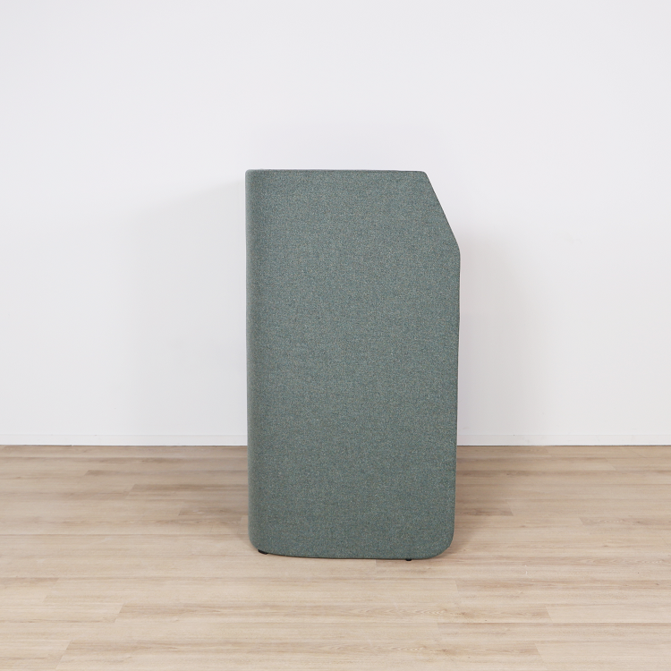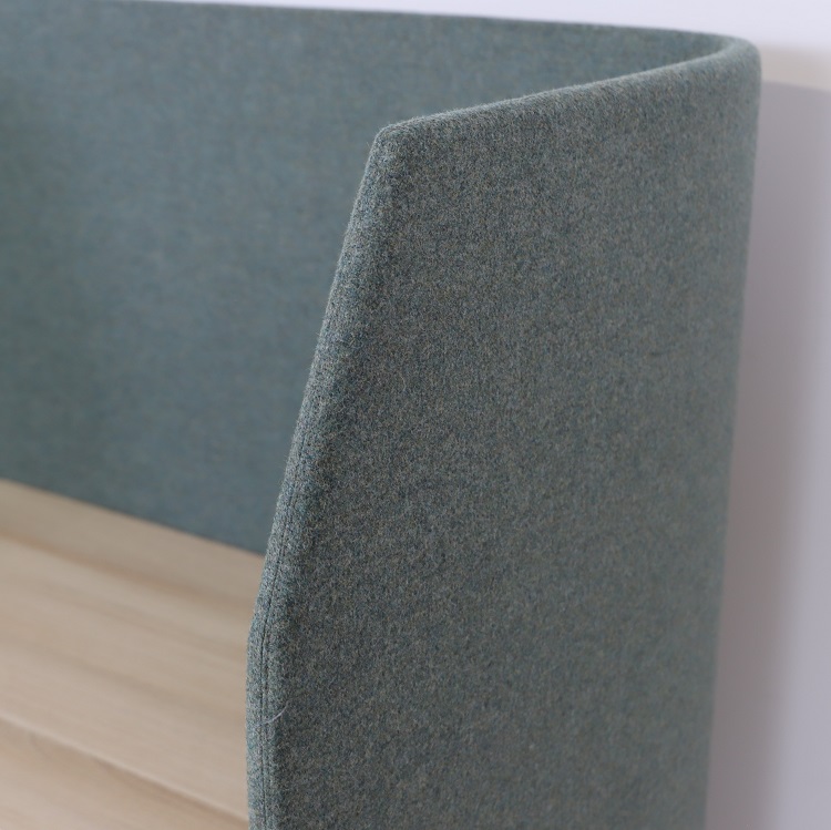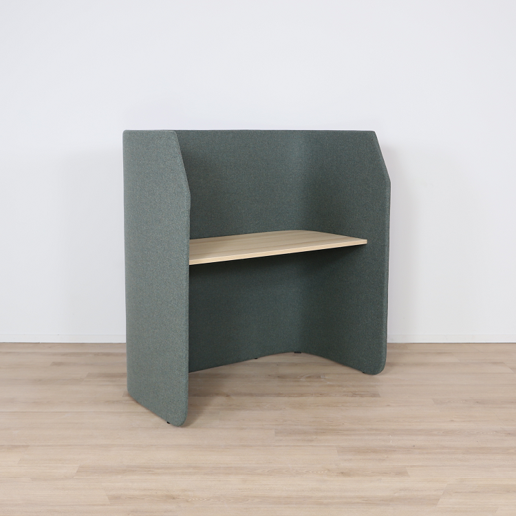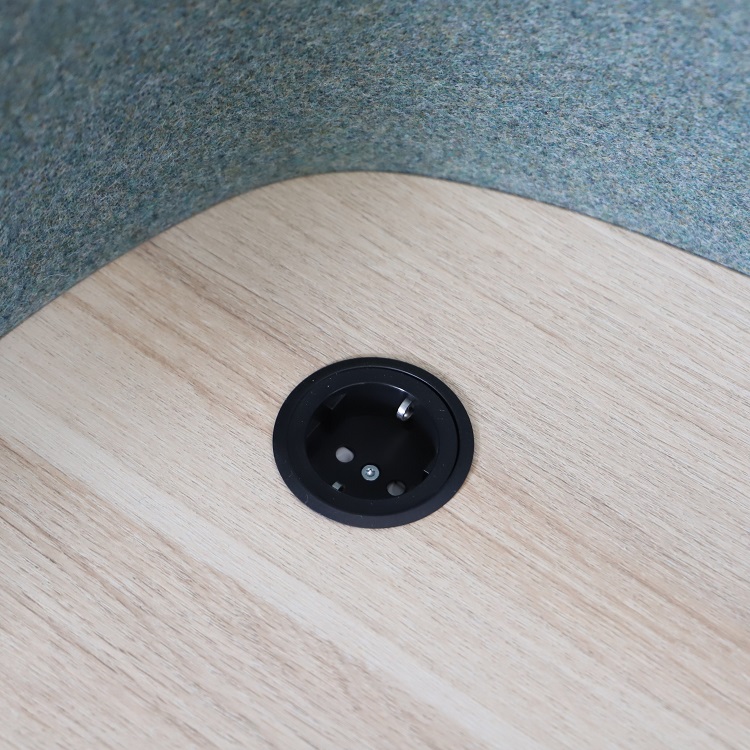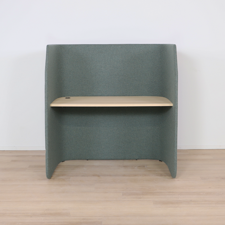 Den ljusa bordsskivan i laminerat trä ger en mjuk och behaglig kontrast mot det dova gröna tyget med blåa inslag och ljudabsorberande egenskaper, perfekt för att ge en varmare känsla till rummet. Bordsskivan är även utrustad med eluttag för att optimera arbetsytan.