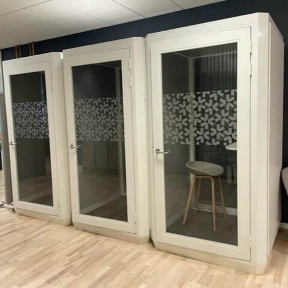 De ljudabsorberande väggarna och glaset isolerar effektivt både in- och utgående ljud. Den har även frostat glas i mitten av glasytan som hindrar insyn och låter dig fokusera på samtal eller arbete utan att bli störd av omgivningen. Samtidigt behålls en öppen och luftig känsla i rummet, vilket skapar en perfekt balans mellan avskildhet och transparens.