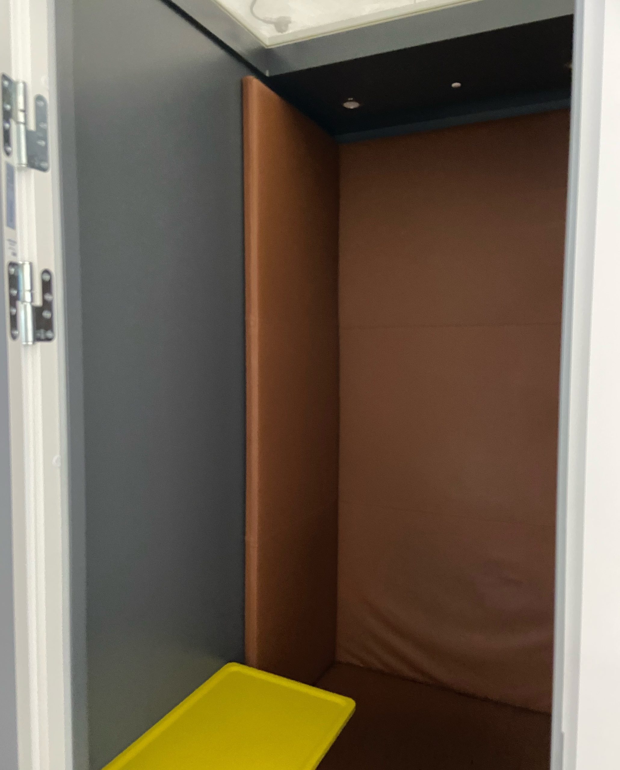 Tyst Rummet är en ljudisolerad samtals- och arbetspodd som skapar en avskild och lugn miljö i det öppna kontorslandskapet. Podden är utrustad med en brun soffa och ett mindre avlastningbord för din kopp eller telefon. Slappna av och koncentrera dig vid samtal eller mer fokuserat arbete där avskärmning är en fördel.